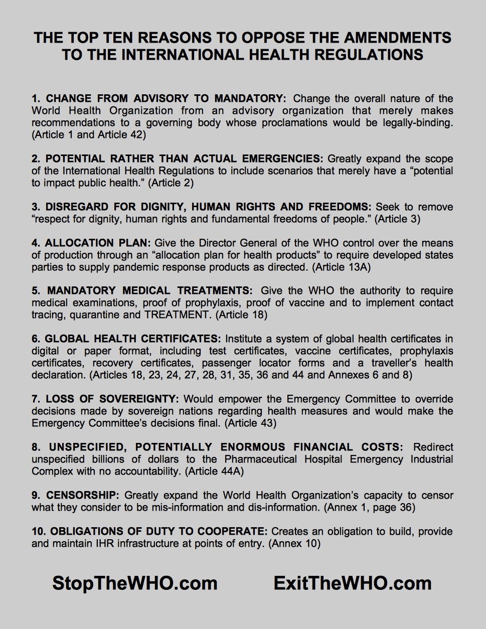 No such authority shall ever be given to the WHO insofar as it would directly conflict with the sovereign authority of the 194 member nations and the fundamental freedoms of all people.