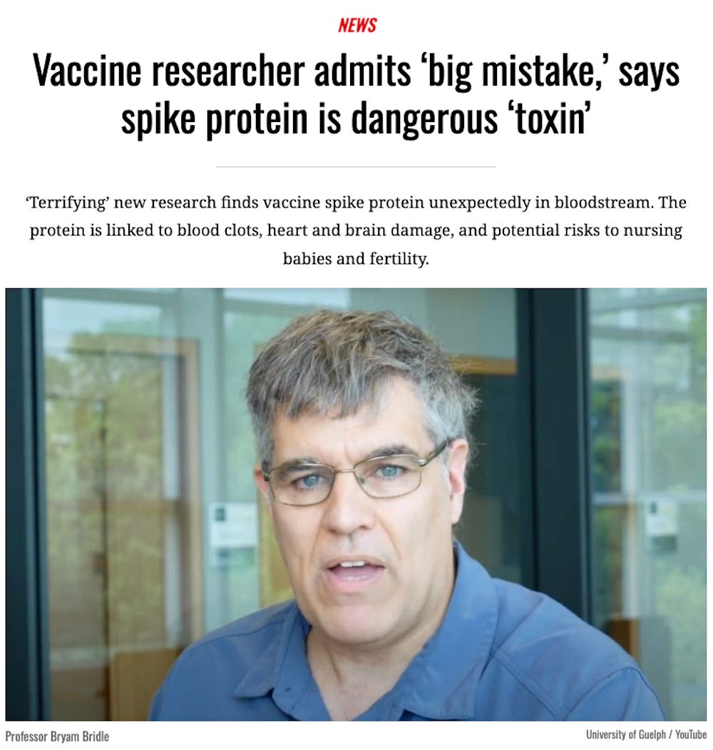 “We thought the spike protein was a great target antigen, we never knew the spike protein itself was a toxin and was a pathogenic protein. So, by vaccinating people we are inadvertently inoculating them with a toxin,” Bridle said on the show, which is not easily found in a Google search but went viral on the internet this weekend.