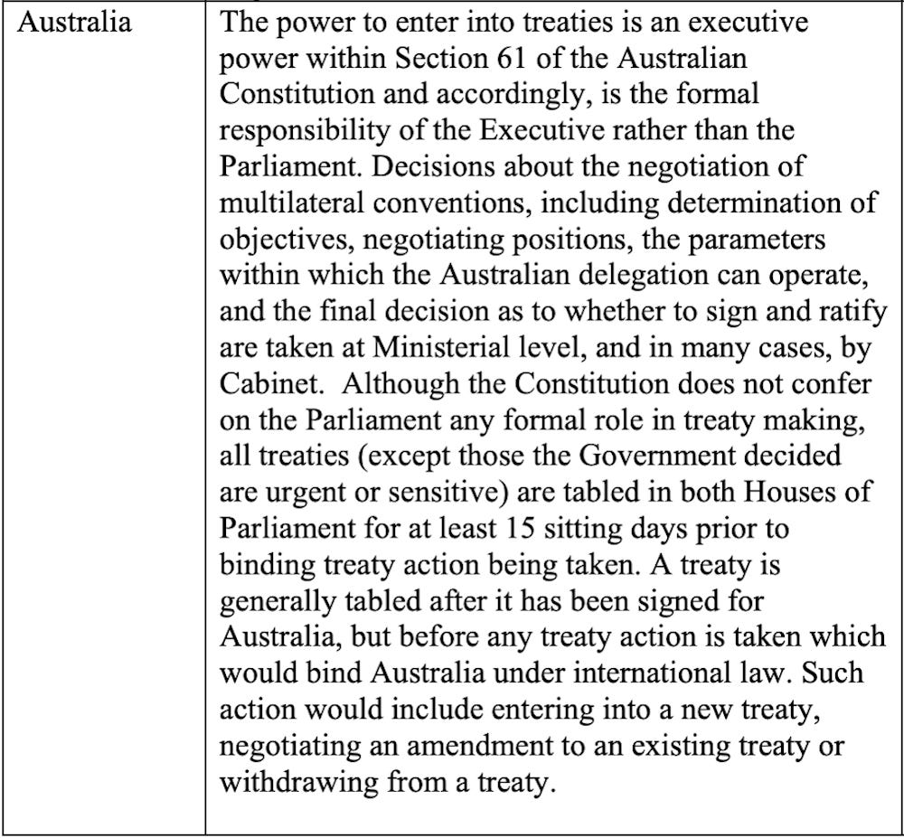 The Executive branch of the Australian government has the sole authority to enter into international treaties, conventions, agreements or amendments to exiting WHO regulations.