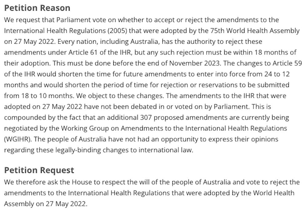 The Australian Government is trying to ignore a petition that was signed by 55,697 Australians requesting a vote on the amendments to the IHR, but they conveniently neglected to give the real reason.