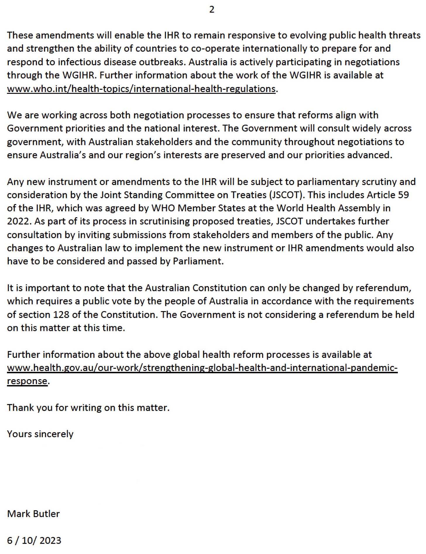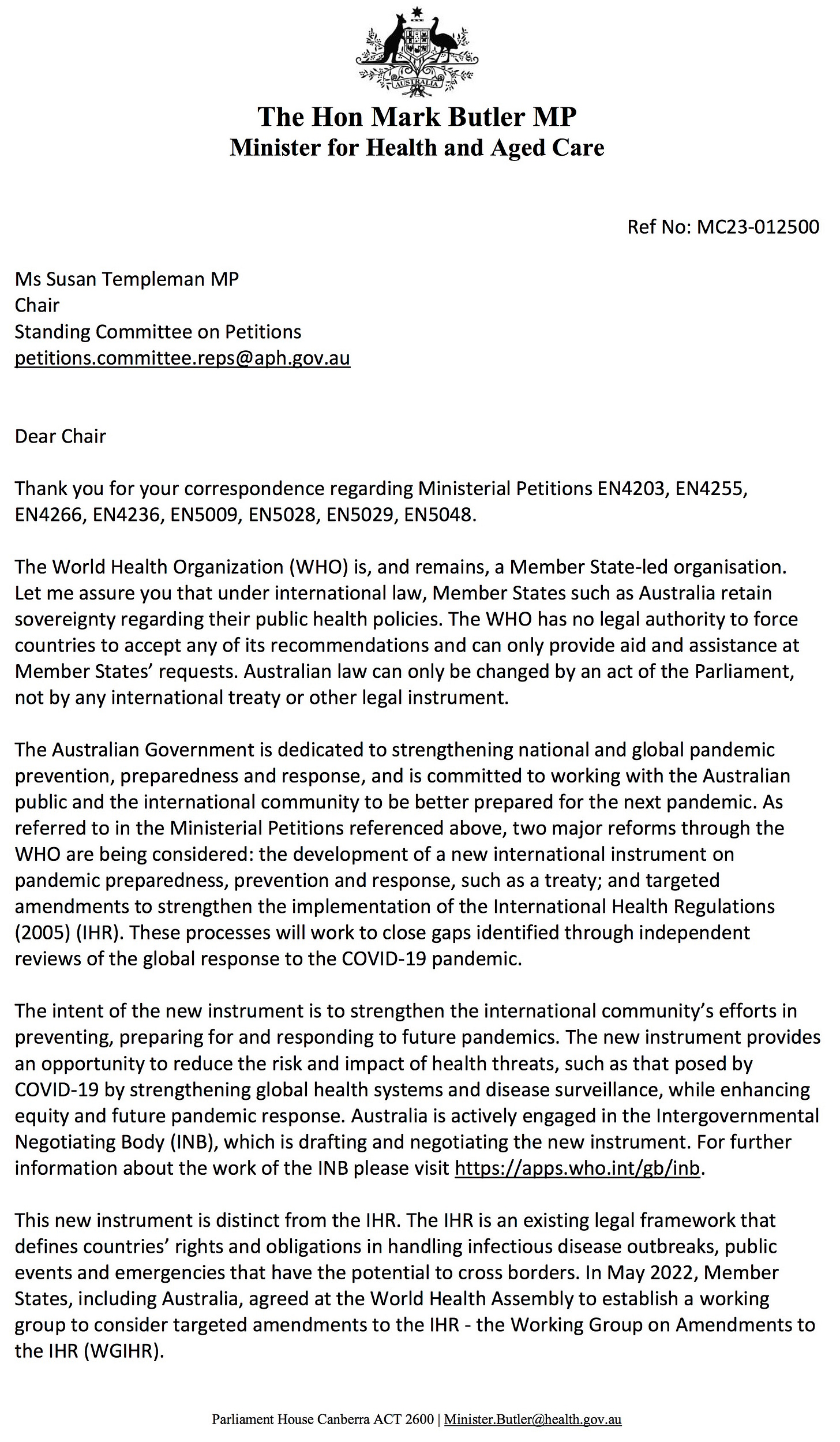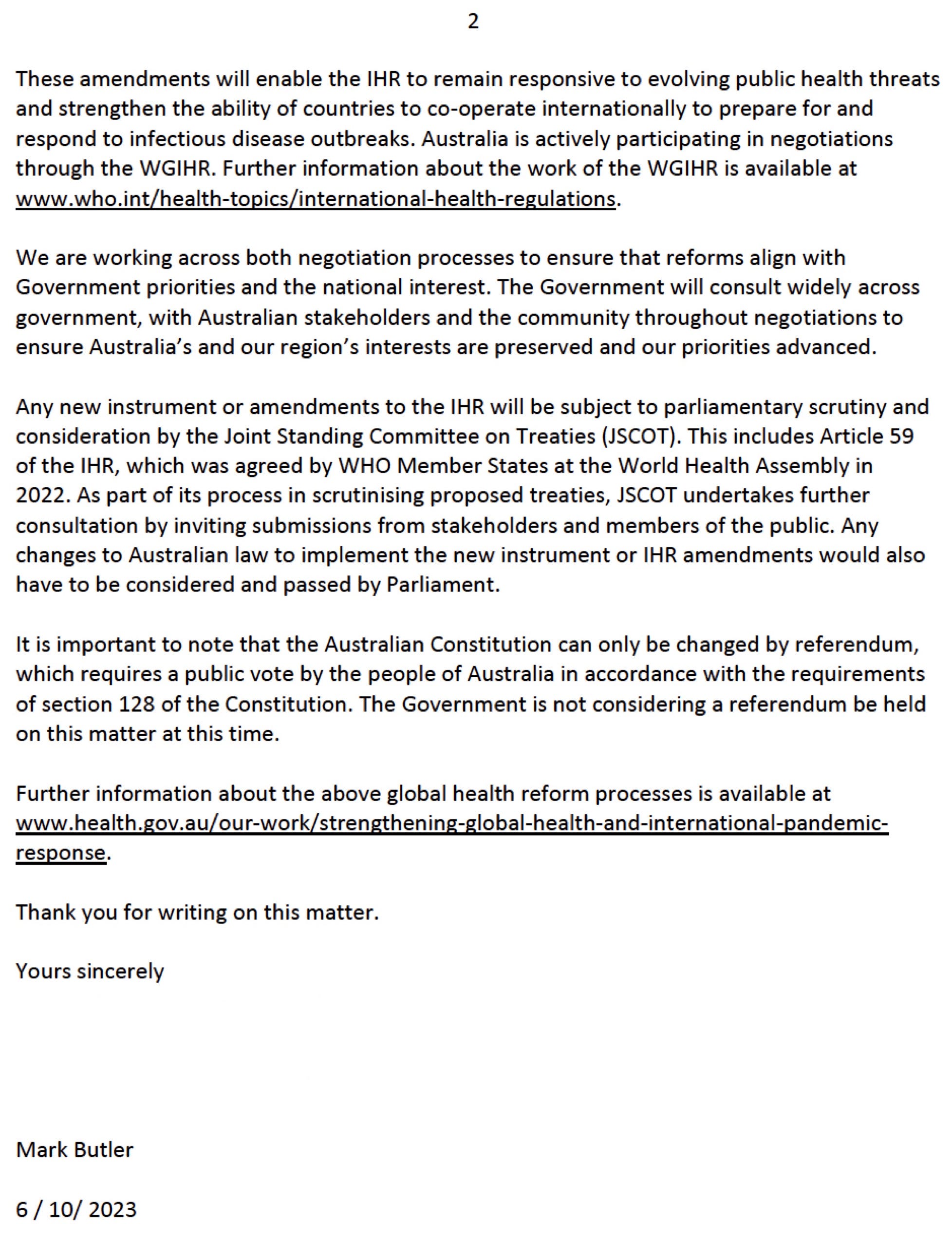 Australia’s Joint Standing Committee On Treaties (JSCOT), Minister of Health Mark Butler, the Department of Health and Aged Care, and the Secretariat of the Petitions Committee have attempted to ignore the 55,697 Australians who signed a petition requesting a Parliamentary vote regarding the amendments to the International Health Regulations that were adopted on May 27, 2022 and should be rejected before December 1, 2023.