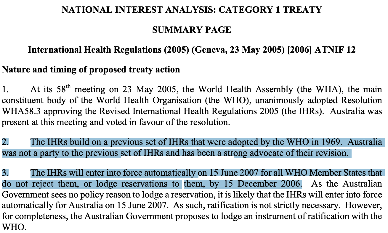 The International Health Regulations entered into force because the Australian government failed to reject them.