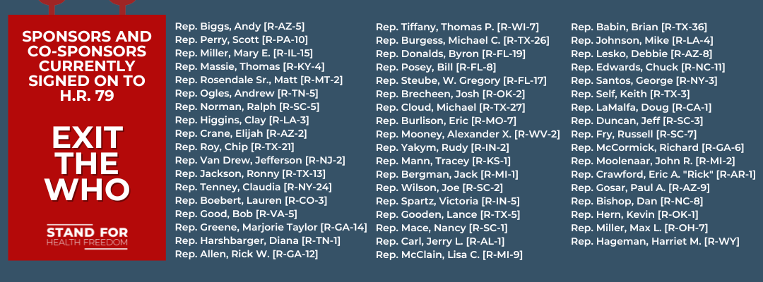 House Resolution 79, also known as the WHO Withdrawal Act, was sponsored by Representative Andy Biggs of Arizona on January 9, 2023. Representatives Perry, Miller, Massie and Rosendale joined him as original co-sponsors.