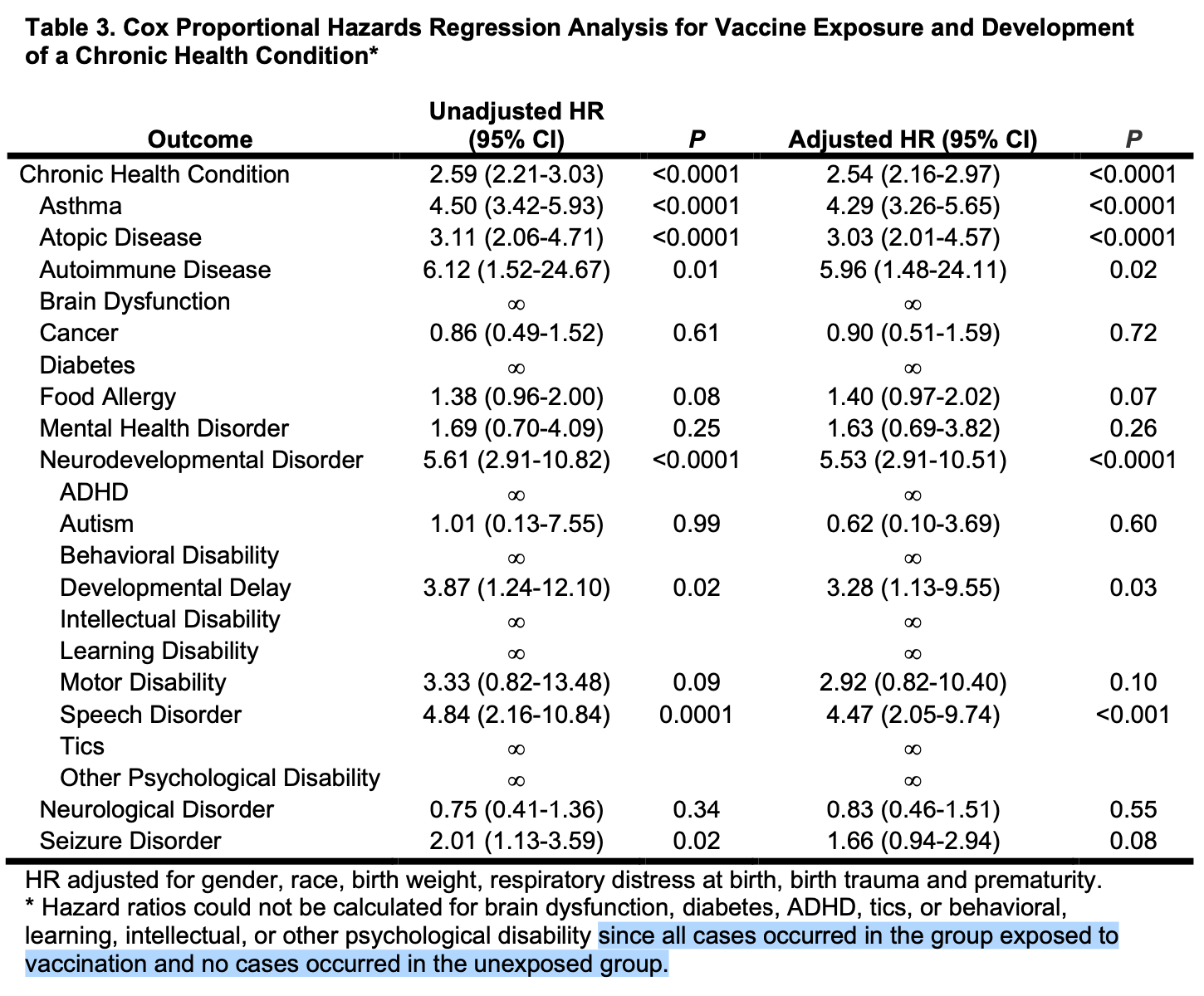 This suggests that in certain children, exposure to vaccination may increase the likelihood of developing a chronic health condition, particularly for one of these conditions.