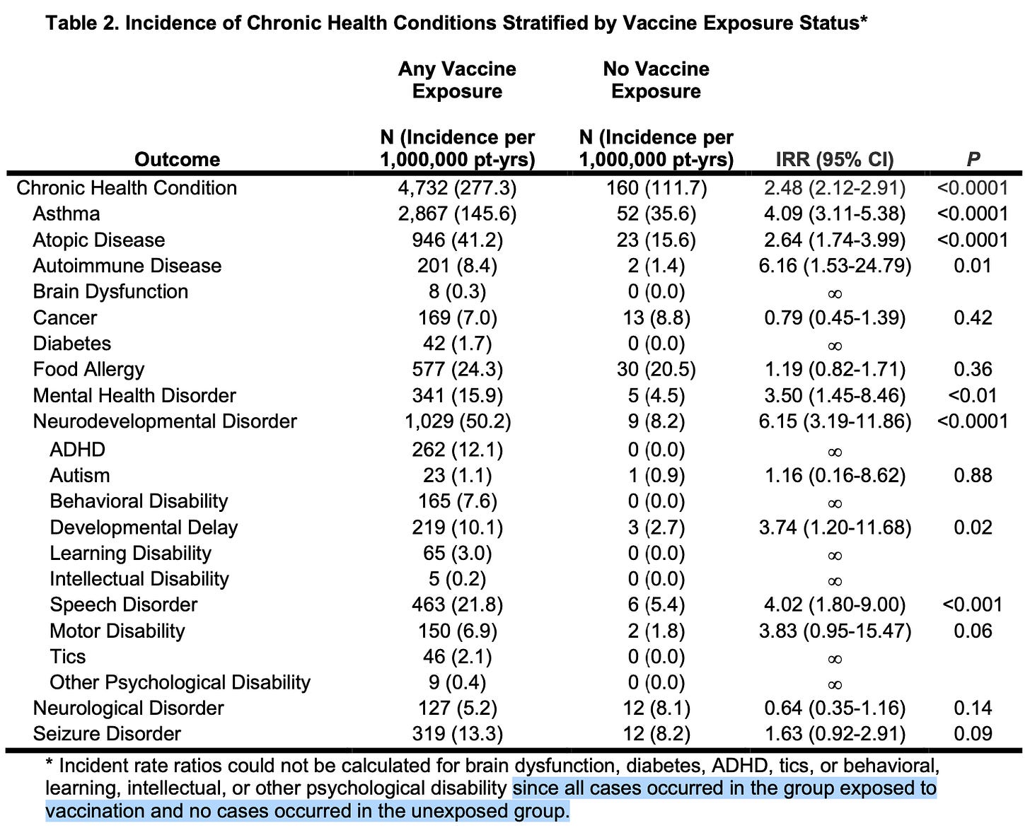 This study found that exposure to vaccination was independently associated with an overall 2.5-fold increase in the likelihood of developing a chronic health condition, when compared to children unexposed to vaccination. This association was primarily driven by asthma, atopic disease, eczema, autoimmune disease and neuro-developmental disorders