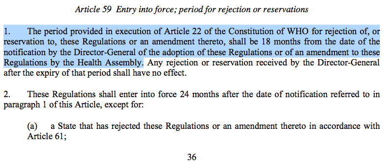 Currently, every country in the world has 18 months to tell the World Health Organization that they simply reject any new amendments to the International Health Regulations. All the countries have to do is send a notification to the WHO that they reject the amendments This is similar to a line item veto.