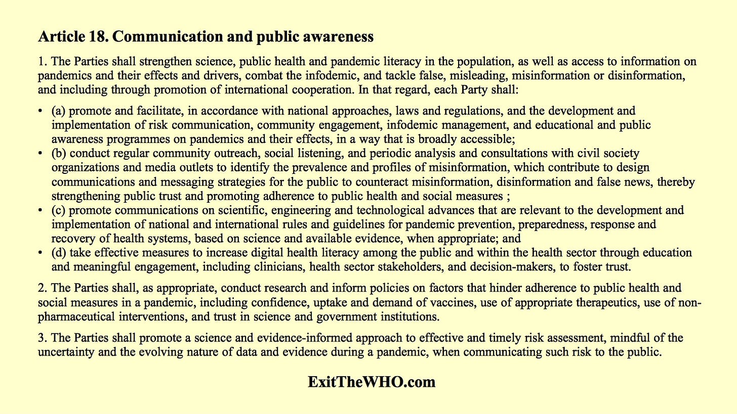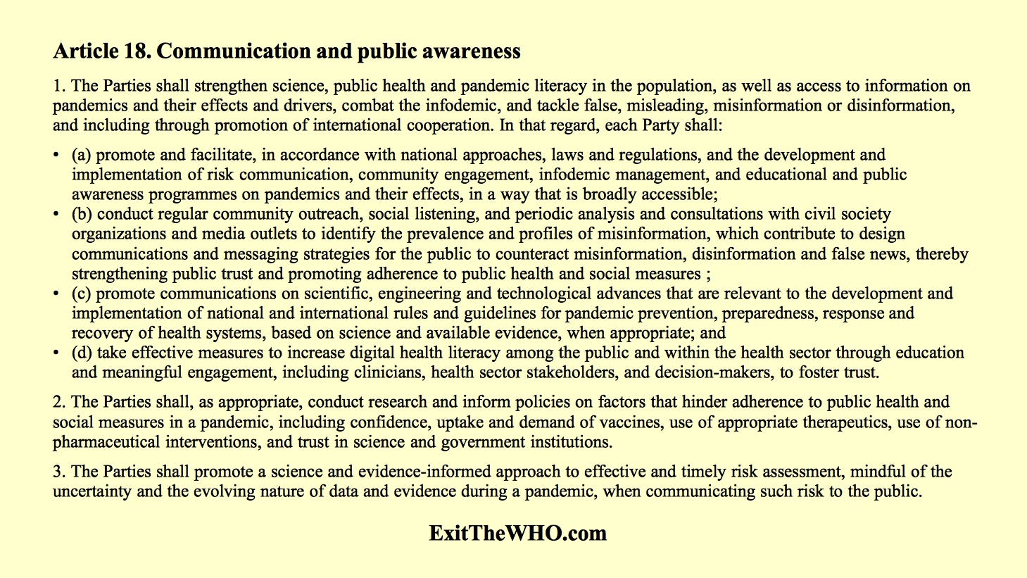 The “Bureau’s Text” of the proposed “Pandemic Treaty” includes a very important proposal (Article 18) designed to empower the World Health Organization to improve “Communication and Public Awareness.”