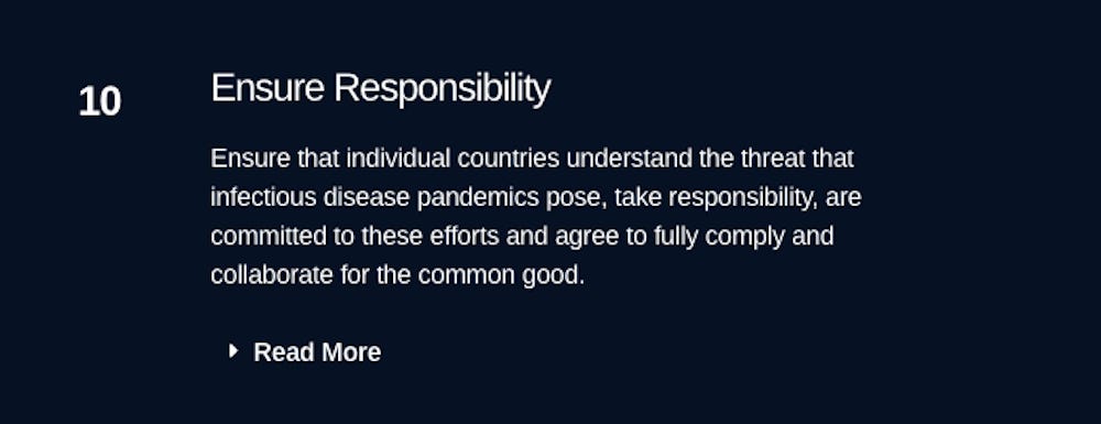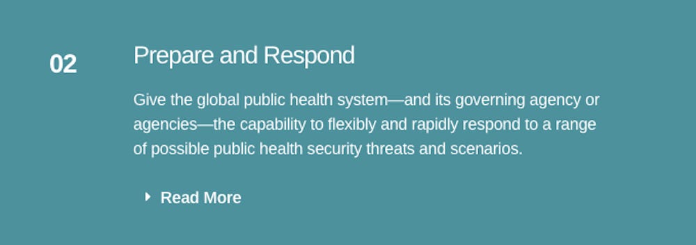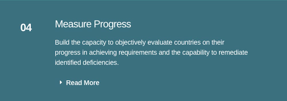 Objectively monitor each country’s progress and compliance in meeting outbreak/pandemic preparedness and response requirements. Monitor progress independently rather than relying on countries to report progress themselves. Make the evaluations publicly available to ensure transparency and promote compliance. Require remediation when there are gaps in countries’ readiness or response and assist countries in achieving compliance.