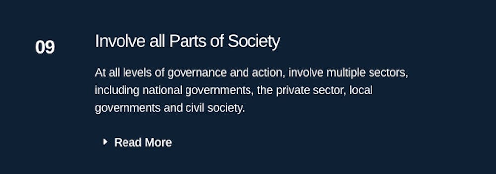 Participating stakeholders must include the private sector, philanthropic organizations, non-governmental organizations, local governments, and academia. Local public health sectors typically responsible for prevention, preparedness and response-related activities must be engaged alongside national governments responsible for determining participation in international agreements.