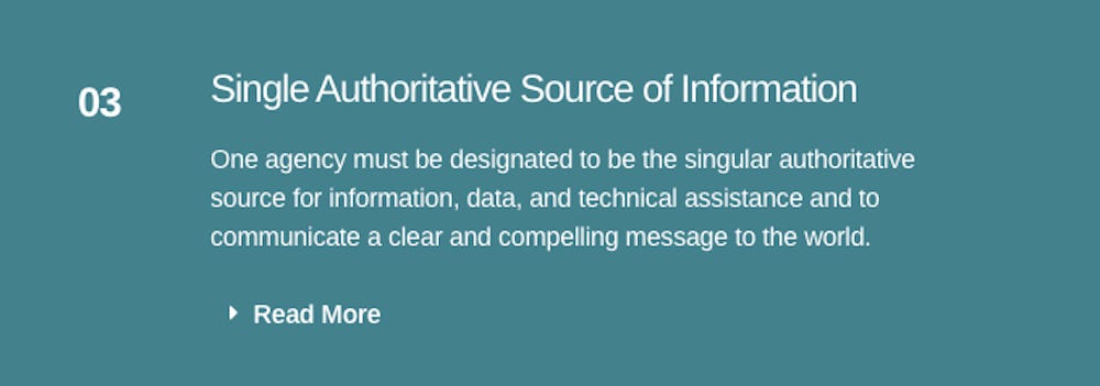 Continue to support WHO as the agency that creates and communicates preparedness and response standards for the world without undue political interference. Communicate compelling, evidence-based, authoritative, consistent information when needed. Particularly in a public health emergency, when situations and data are emerging and uncertain, countries need clear expectations for public health security policies, benchmarks, and activities.