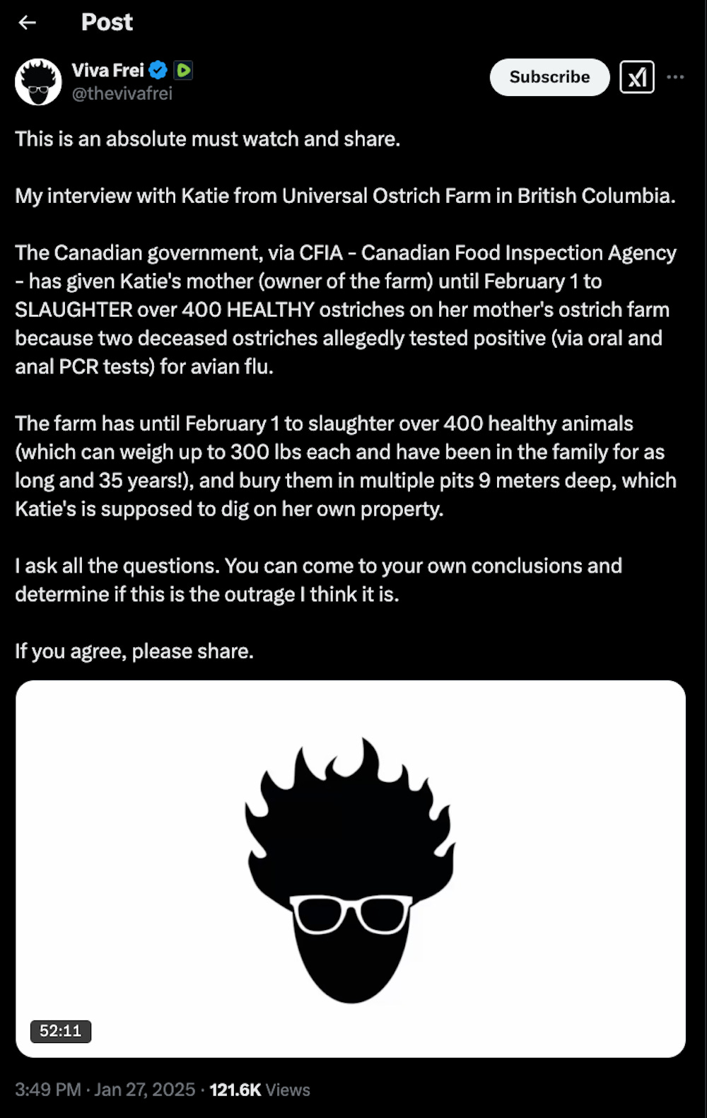 I understand that a court decision has correctly granted a 30 day stay of execution for the Edgewood, BC, Universal Ostrich Farms Herd. Despite that, the Canadian Food Inspection Agency (CFIA) has submitted an application to the court to allow them to proceed with the execution of the herd as soon as possible. This application will be heard as early as WEDNESDAY, 12 February, 2025.