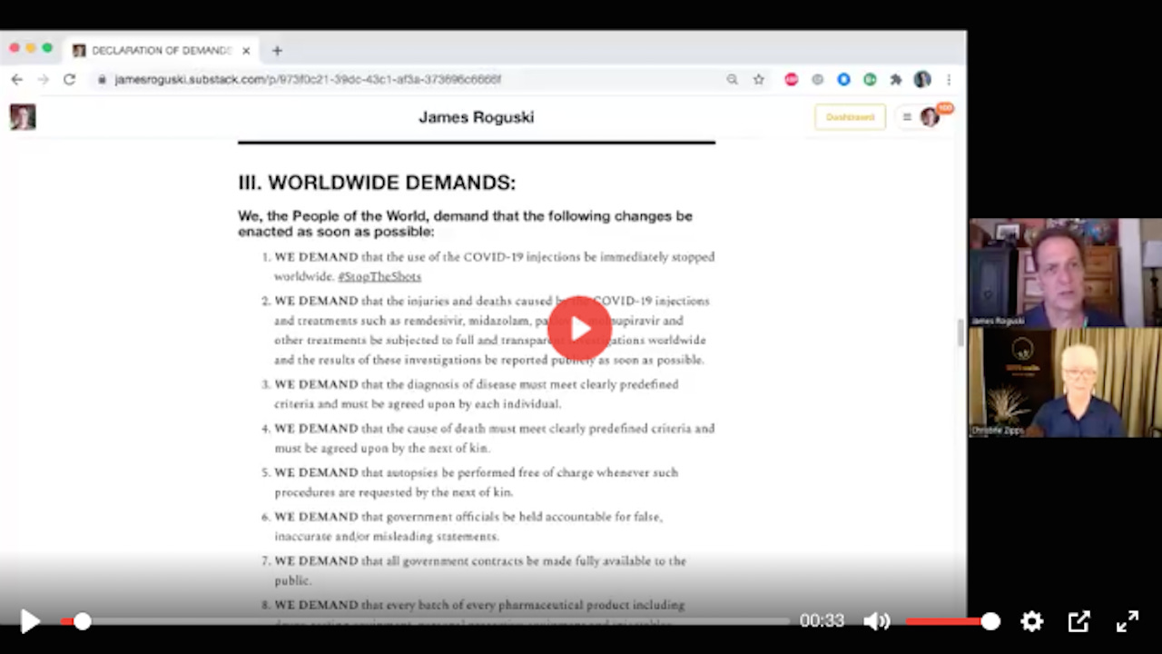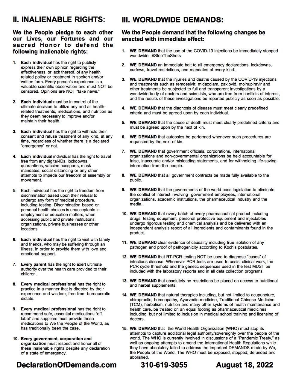 WE DEMAND that the injuries and deaths caused by the COVID-19 injections and treatments such as remdesivir, midazolam, paxlovid, molnupiravir and other treatments be subjected to full and transparent investigations by a worldwide body of doctors and scientists, who are free from conflicts of interest, and the results of these investigations be reported publicly as soon as possible.