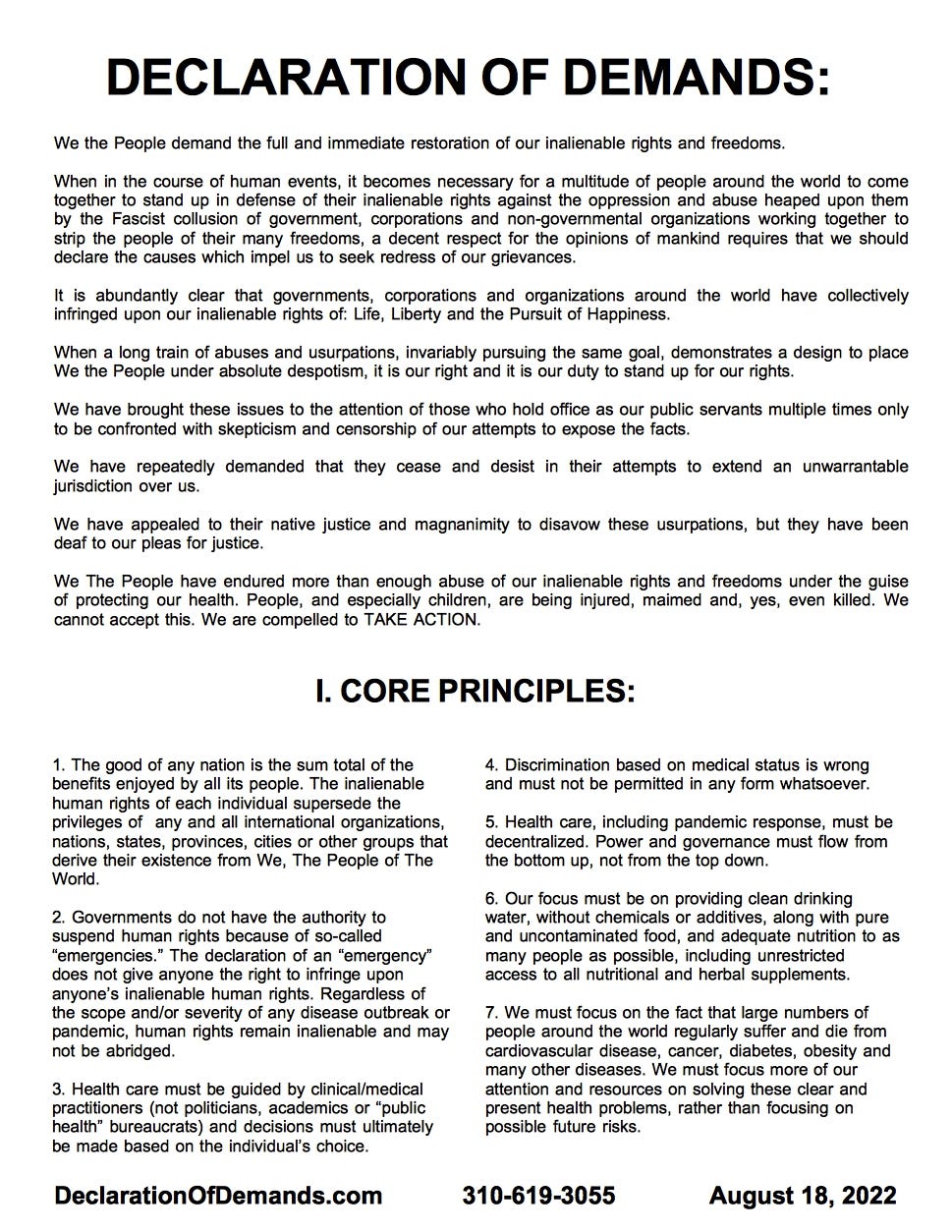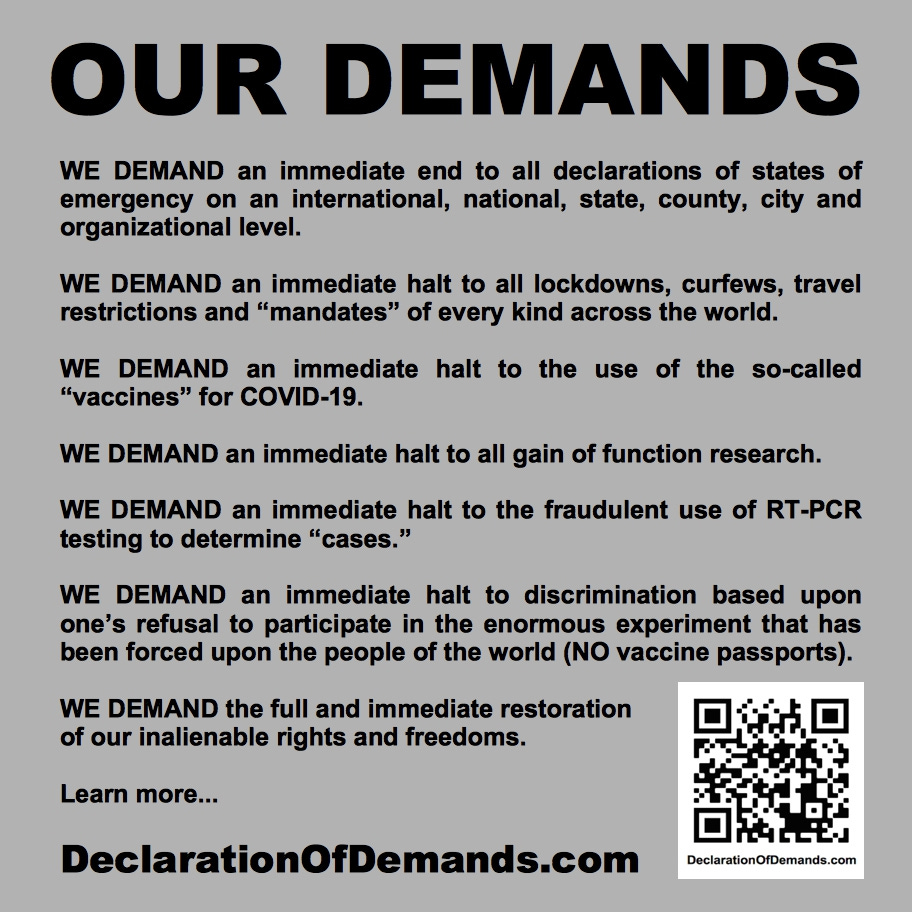 WE DEMAND an immediate halt to all emergency declarations, lockdowns, curfews, travel restrictions, and mandates of every kind.