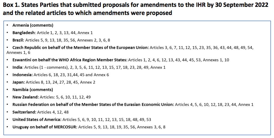 As of October 30, 2022, the World Health Organization (WHO), the Working Group for amendments to the International Health Regulations (WGIHR) and the International Health Regulations Review Committee (IHRRC) have NOT published the proposed amendments submitted by 14 member nations. The IHRRC has only published an outline of the proposed amendments as seen below.