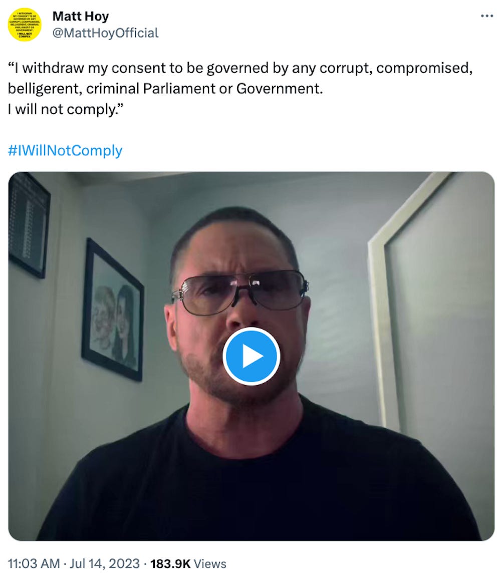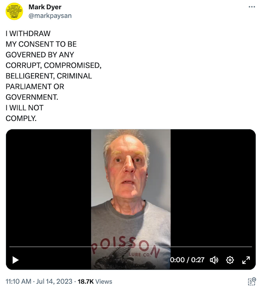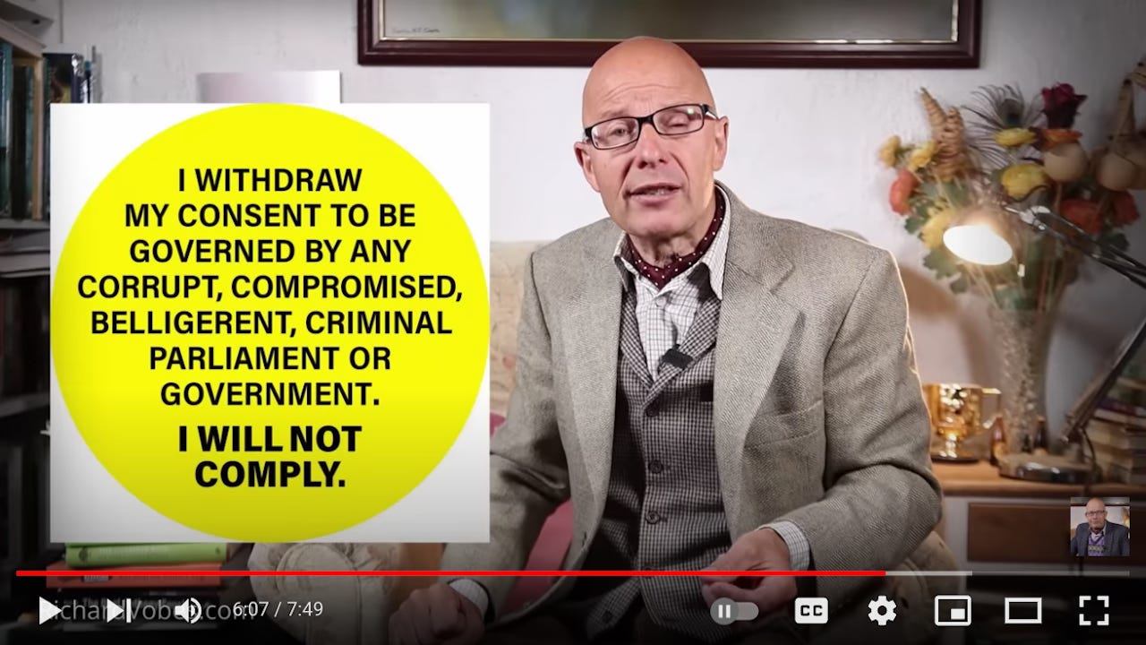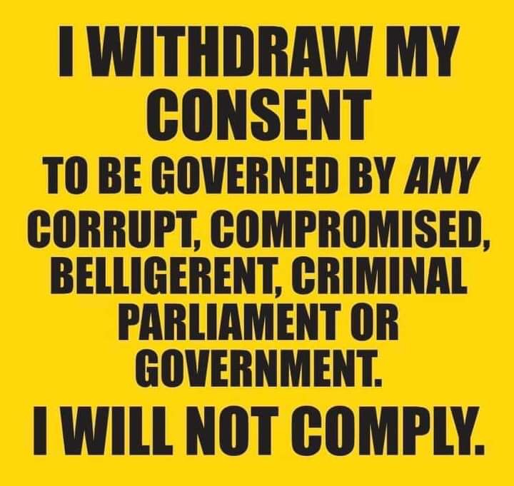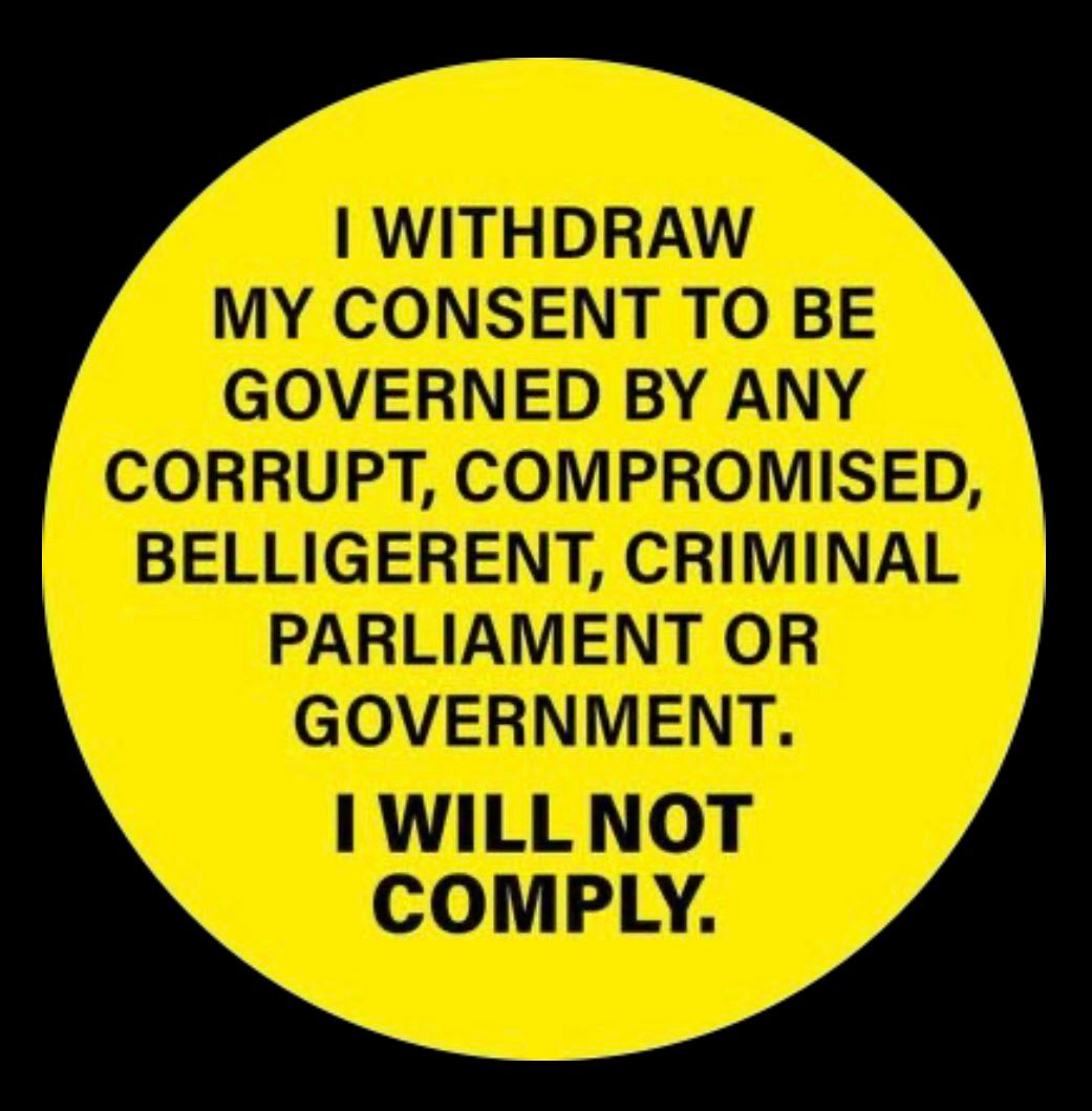 You are hereby being notified that I withdraw my consent, as is my fundamental right, to be governed by any corrupt, compromised, belligerent, criminal Parliament or Government. I will not comply but I will remain lawful and keep the peace.