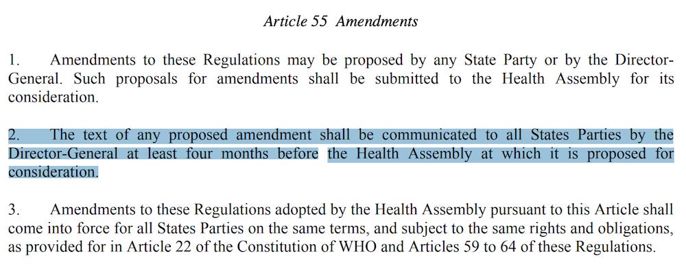Thank you James for this very clear rule that is only just and essential for the member nations of the WHO to be able to read and consider the IHR amendments that they will be voting on in May of 2024. It is clear that the WHO working group has not met the deadline and therefore the member nations cannot be expected to have appropriate time to consider these very far reaching and amendments that bestow powers on the WHO that were never intended in the formation of this organization and which are threatening to the sovereign rights of the member countries--especially the citizens of the US of America.