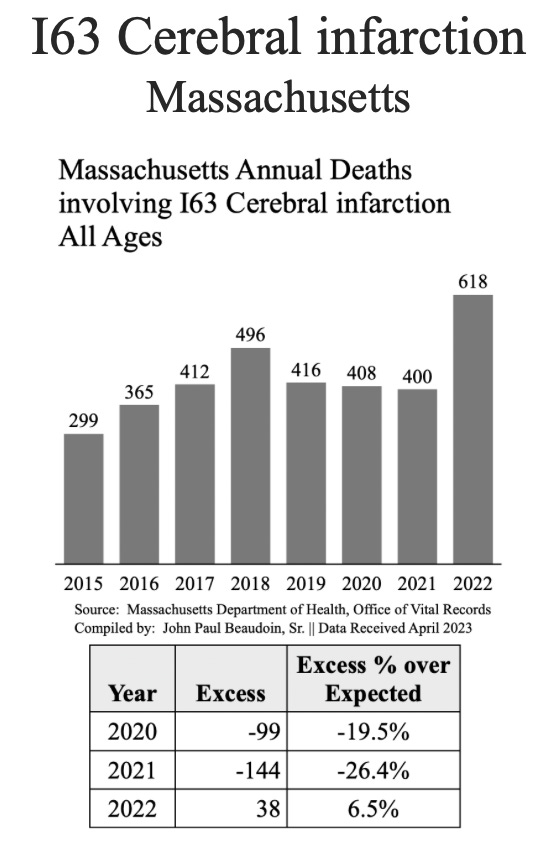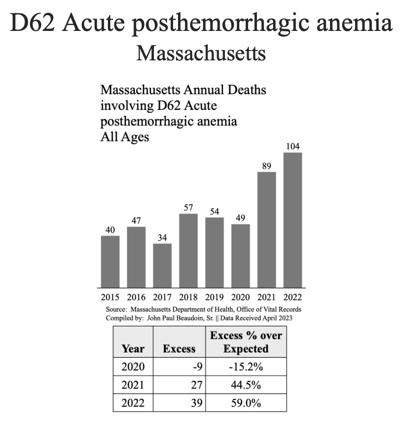 B. The data and graphs in the exhibits yields well over four thousand five hundred (>4,500) excess deaths in Massachusetts from causes attributed to covid immunizations in 2021 and 2022. This extrapolates to more than two hundred thousand (>200,000) deaths likely from covid immunization causes such as Cardiac arrest, Cardiac arrhythmia, Pulmonary embolism, stroke, bowel ischemia, aortic dissection, and others. The average ages of deaths of people who survived two to three (2-3) waves of covid, but did not survive covid immunization, is more than ten years younger than deaths from covid per se. The life-years-lost by covid immunization is, thus, ten times (10X) greater than from covid per se. (page 177)