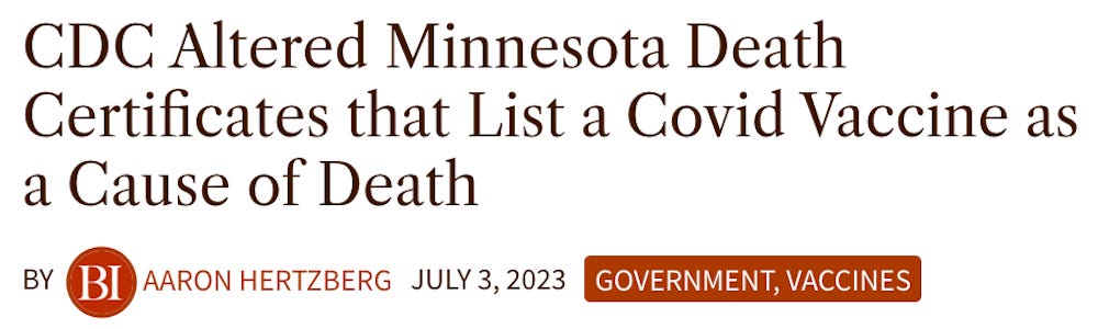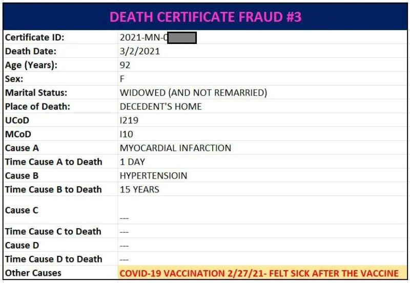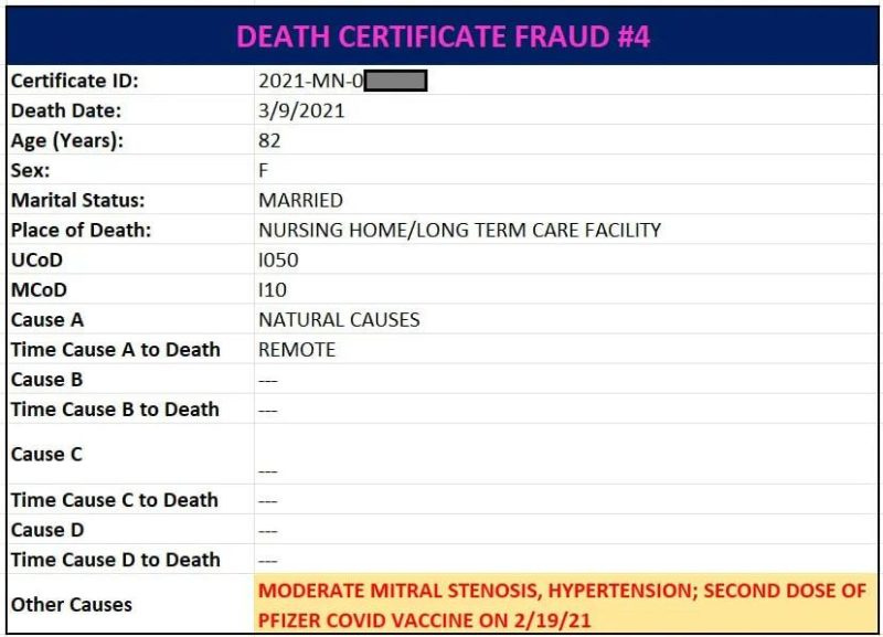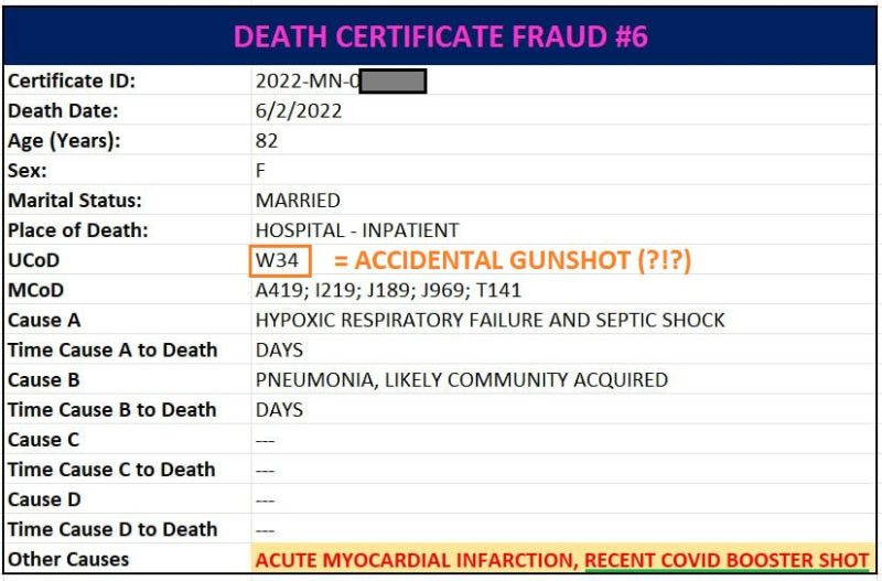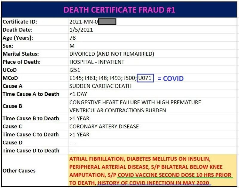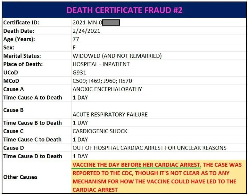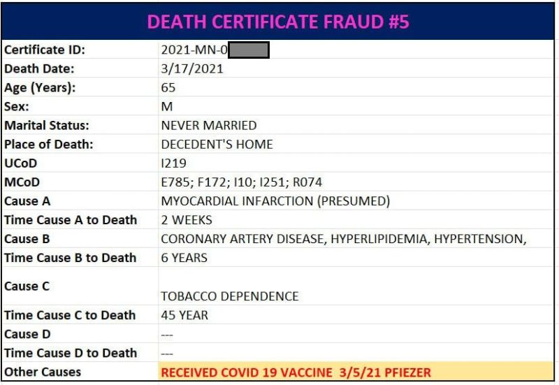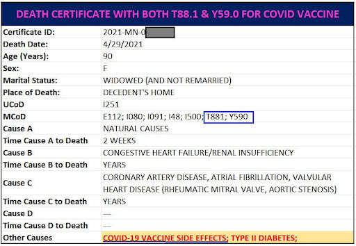 As we shall document, the CDC is concealing references to a covid vaccine on Minnesota death certificates (that are exceedingly rare to begin with because of widespread medical establishment denialism of vaccine adverse side effects). In almost every death certificate that identifies a covid vaccine as a cause of death, the CDC committed data fraud by not assigning the ICD 10 code for vaccine side effects to the causes of death listed on the death certificate.