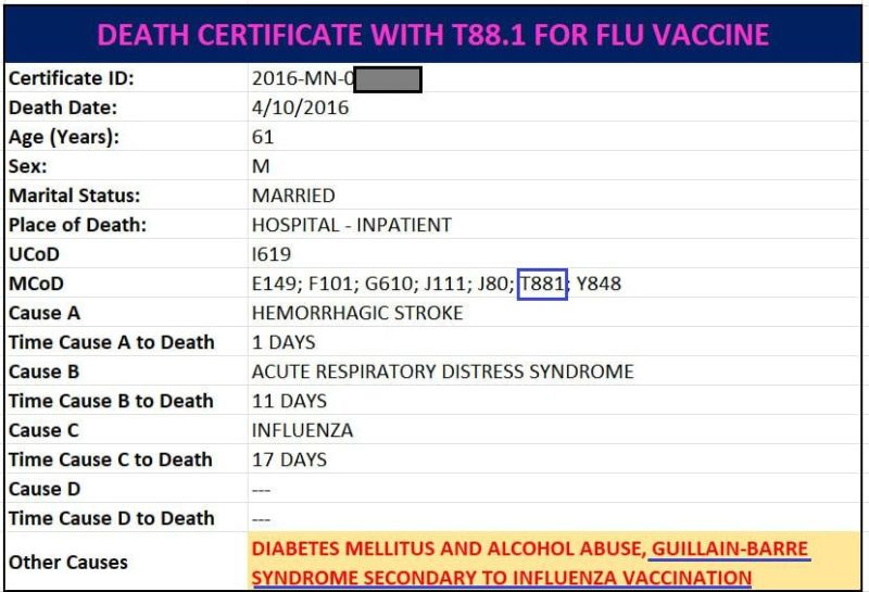 There are three death certificates in the MN tranche that contain either T88.1 or Y59.0. One is for a flu vaccine reaction, and – surprisingly – the other two are for a covid vaccine.