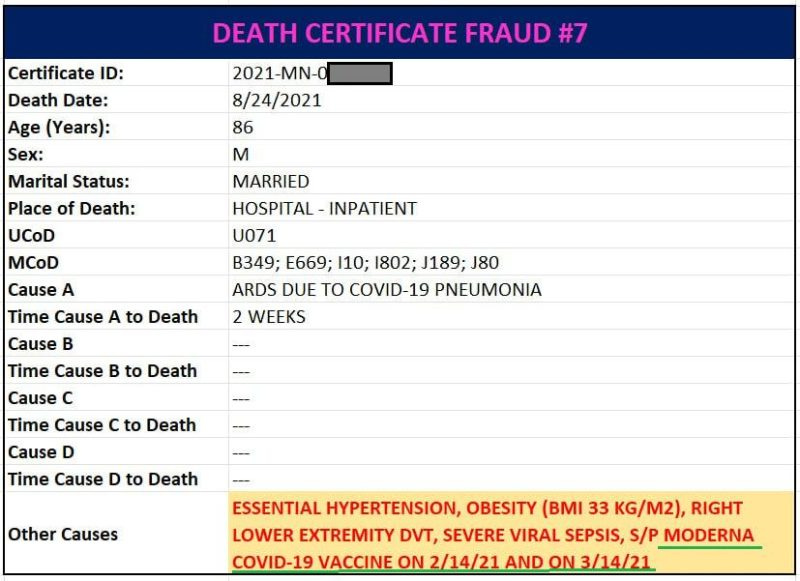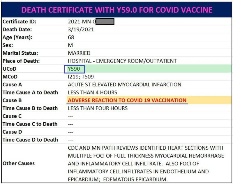 At minimum, this death certificate should contain T88.0 – ‘Infection following immunization’ – to document the breakthrough infection (which is a subject for a separate article as this seems to be fairly widespread).