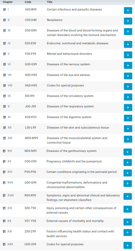 The current iteration of the ICD that was used for the deaths we’re looking at is the ICD 10 (that’s the 10th version). It is basically a hierarchical classification system: