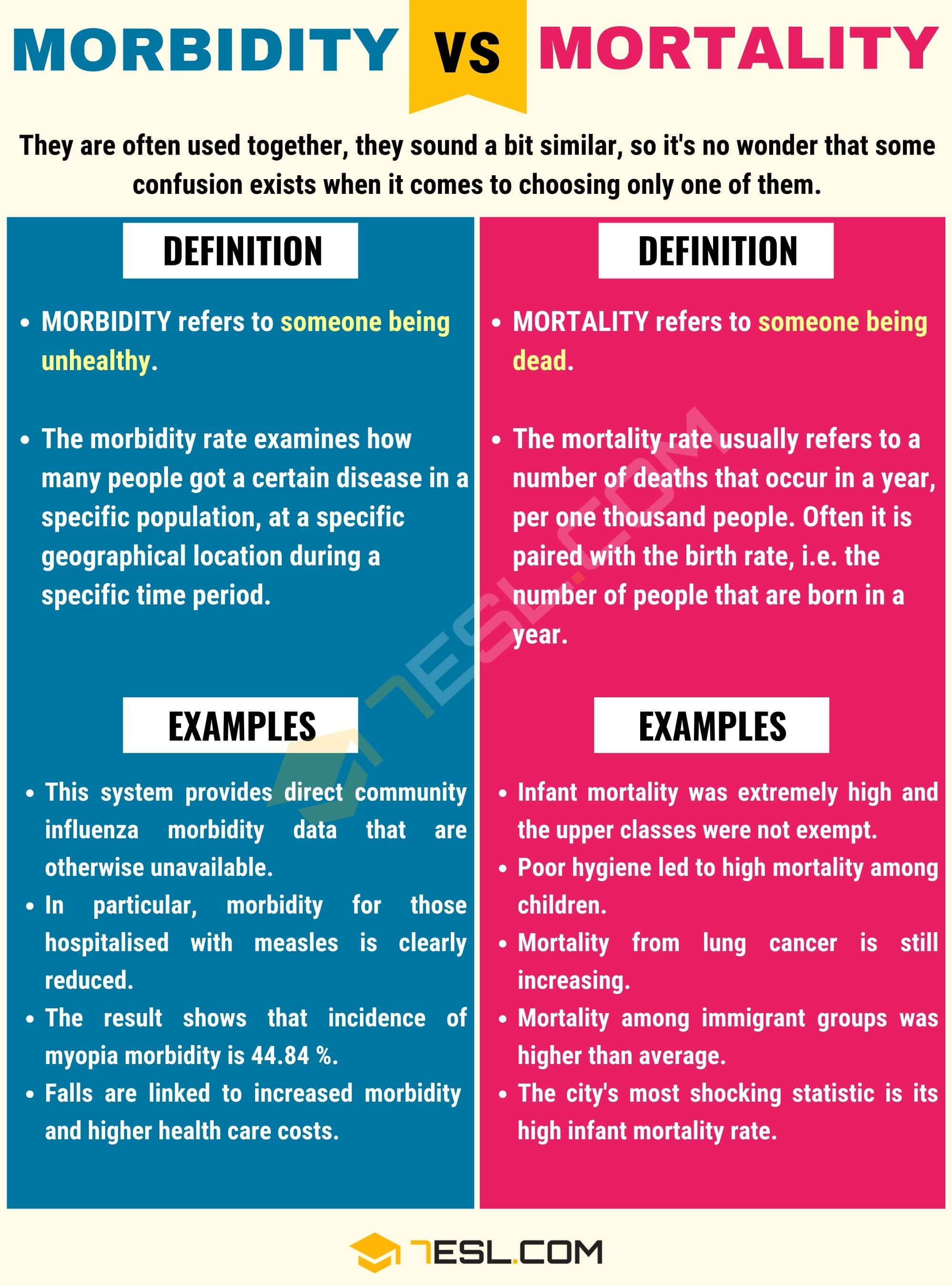 Morbidity typically refers to having a specific illness or health condition, while mortality refers to the number of deaths that a specific illness or health condition caused.