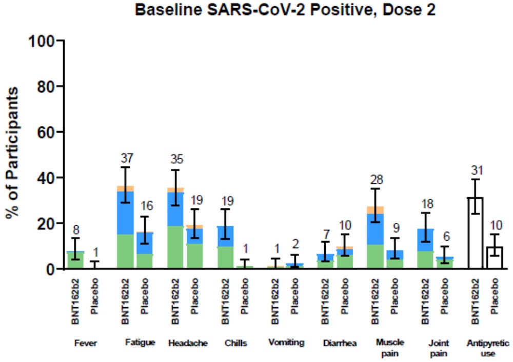 In participants that were COVID positive on the day of Dose 1 injections (before the vaccinations had time to work) a robust production of anti-nucleocapsid antibodies occurred in both placebo and vaccinated groups, with no difference between the groups.