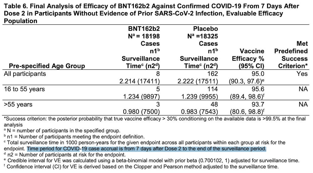 Put differently, COVID-19 cases that occurred before that point—that is, between shot one and seven days after shot two— were not considered when evaluating the efficacy of Pfizer’s vaccine.