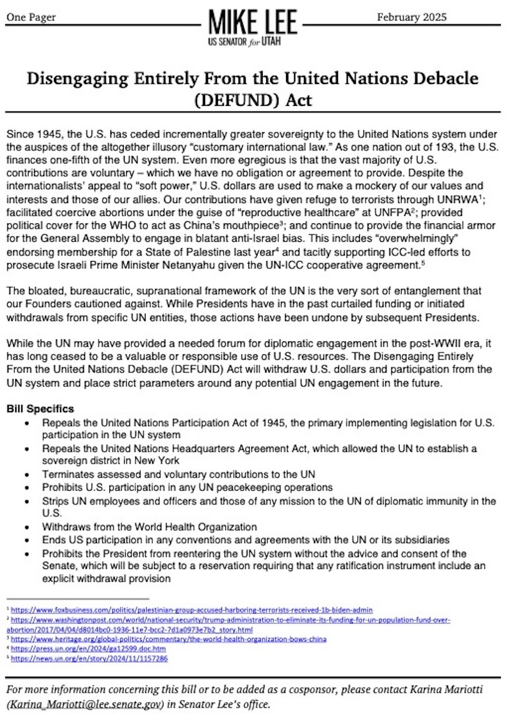 I am calling to encourage the Senator ________________________ to support Mike Lee’s Senate Bill 669 because I want the United States to get out of the United Nations and the World Health Organization.