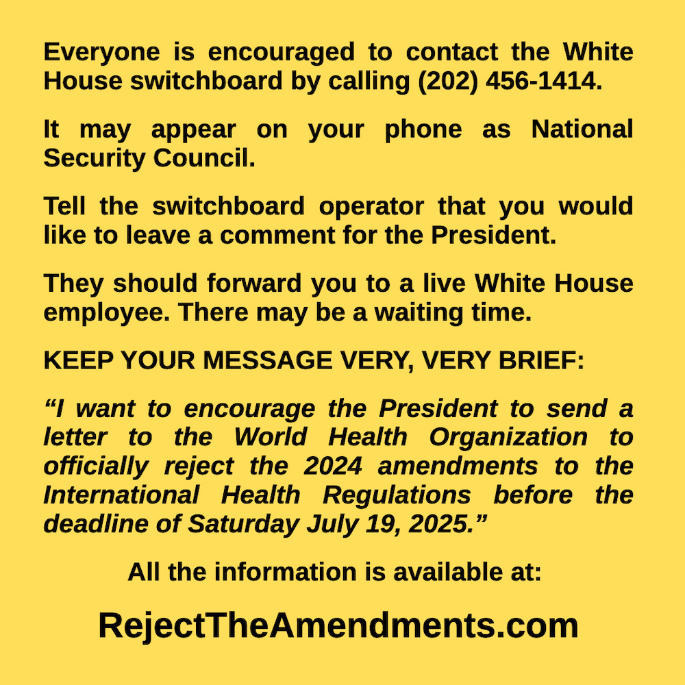 I urge you to reject the amendments to the International Health Regulations (IHR) being advanced by the WHO. These amendments, should the US rejoin the WHO under a future administration, threaten US sovereignty and individual medical freedom. Under Article 59 of the IHR, any Member State can “reject” or enter a “reservation” to specific amendments. A rejection means the amendments do not legally apply to the rejecting country. This is the best way for the US to avoid being bound by undesired amendments. The deadline for rejecting them is July 19, 2025.