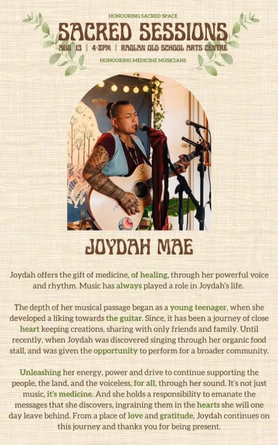 Joydah Mae is a musical healer in New Zealand. Her unique music is an expression of her own struggles and happiness. Discovered at Spirit Fest when she was asked to sing the closing ceremony, she felt the timing was Divine, and since then she has continued to share her music, her voice and her heart for the greater good of all.