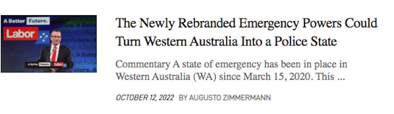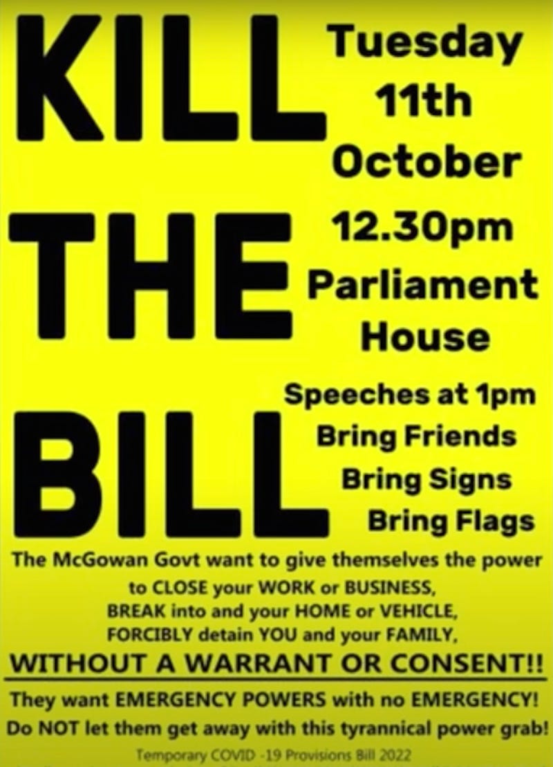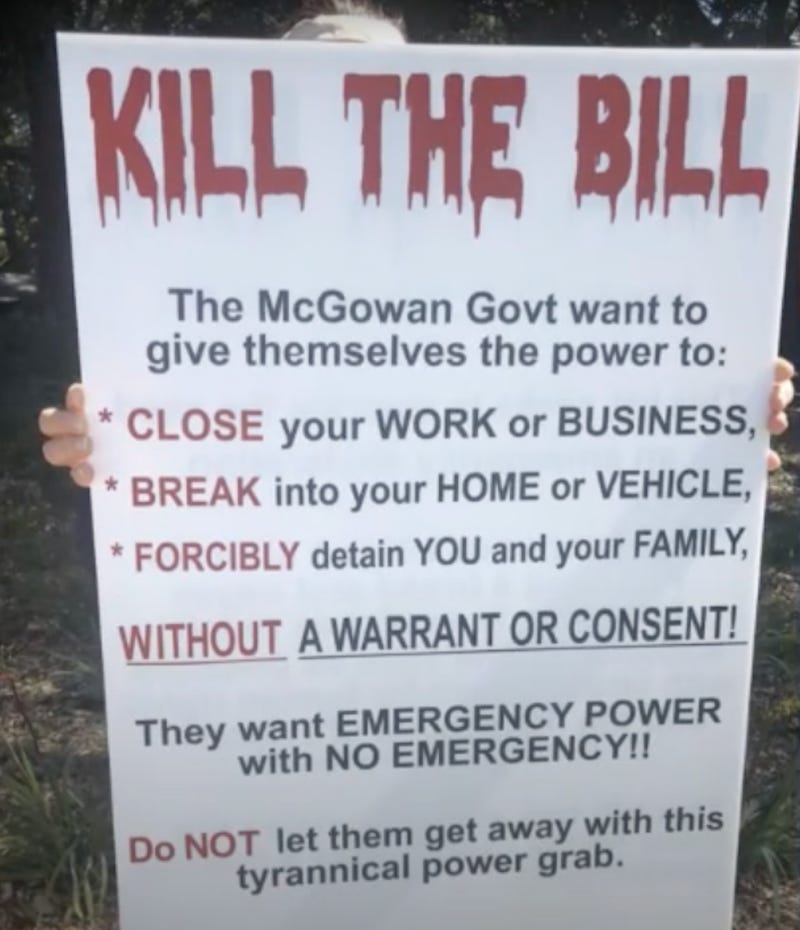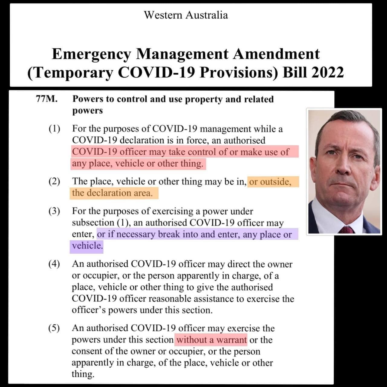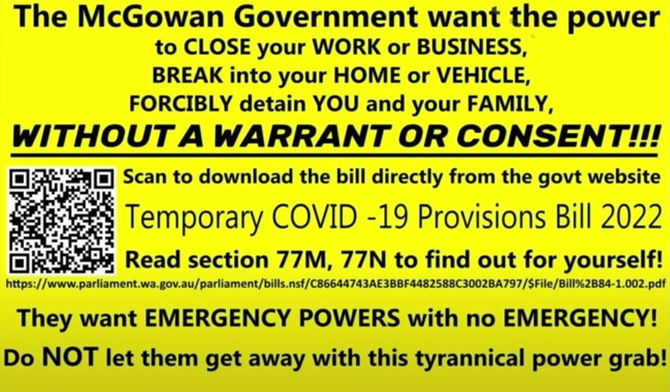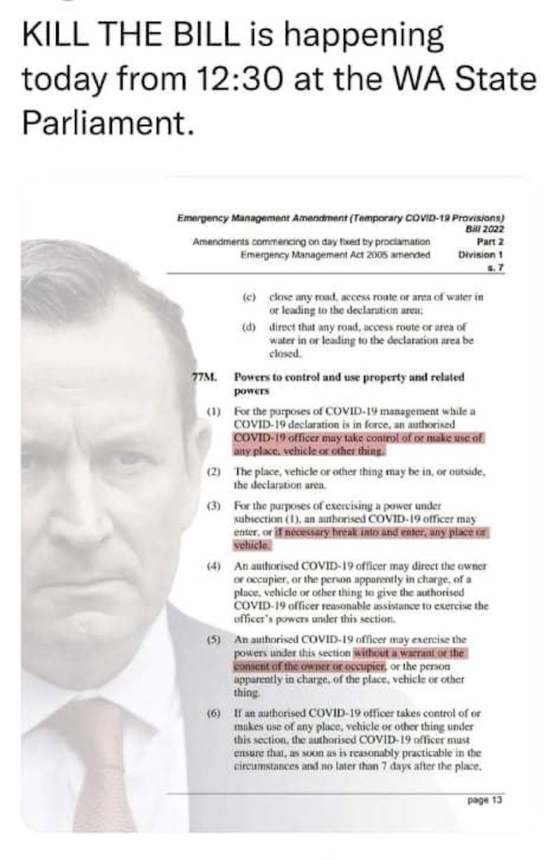 The Western Australia government is pushing forward with outrageously tyrannical laws. The latest assault on civil rights is a bill that is working its way through the Western Australia parliament. Between this bill, the Emergency Management Act & the Public Health Act, the threat to the public is immense: