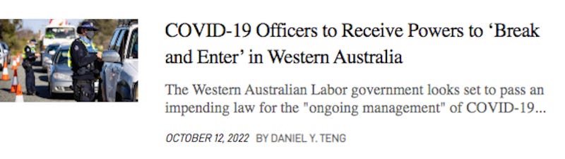 Still, the McGowan government appears bent on enacting further restrictive legislation that permits ‘Covid officers’ to break into vehicles, trespass on property, and breach a host of privacy concerns all to stop a virus that has already demonstrated its imperviousness to mandates.