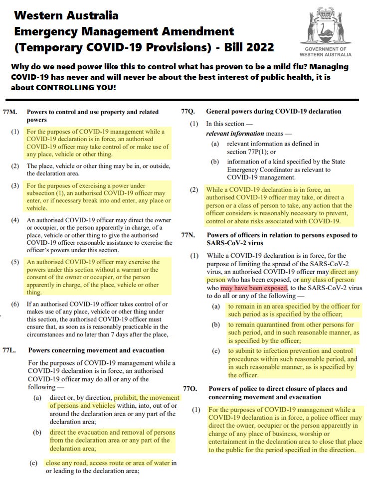 Western Australia government is pushing forward with even more tyrannical laws. The latest assault on civil rights: a bill for future C19 variants is working its way through the Western Australia parliament. Between this bill, the Emergency Management Act & the Public Health Act, the threat to the public is immense: