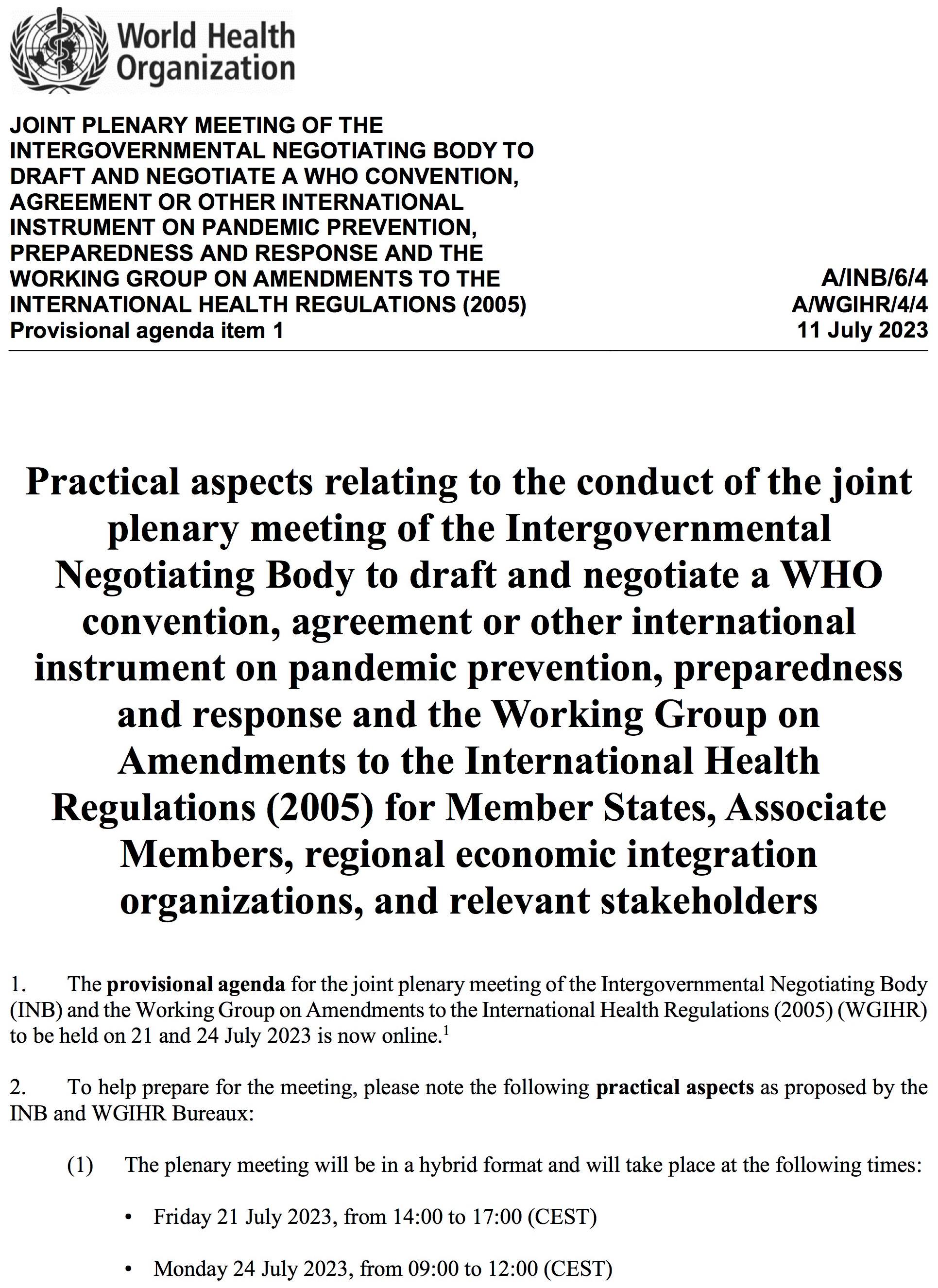 It does NOT address the latest version of the proposed WHO CA+ (AKA: “Pandemic Treaty”) which was also published on June 2, 2023 and is referred to as the “Bureau’s Text.”