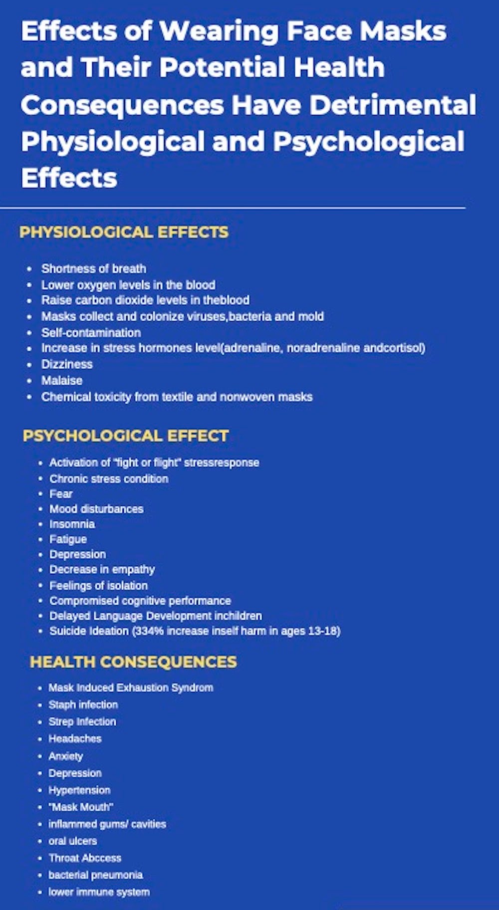 Masks cause oxygen deprivation, headaches, anxiety and a wide variety of physical, mental, emotional and psychological ailments.