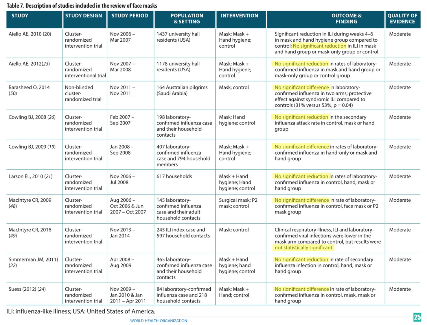 WHO: 2019 review of face mask RCTs (WHO report/annex)