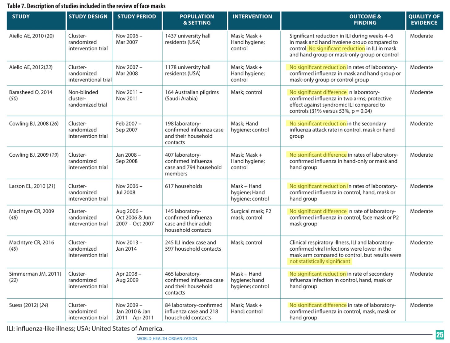 The report reviewed ten randomized controlled trials concerning the effectiveness of face masks against influenza-like illness (ILI). As the following table shows, none of the trials found a statistically significant benefit of face masks.