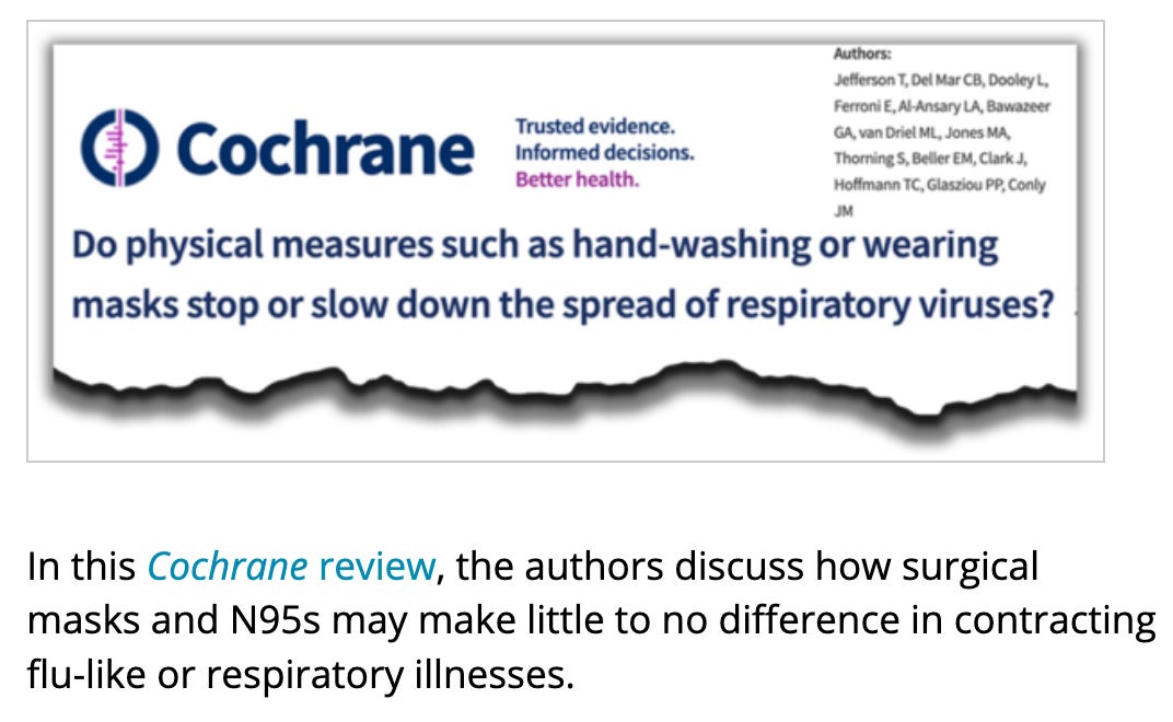 “The pooled results of [Randomized Controlled Trials] RCTs did not show a clear reduction in respiratory viral infection with the use of medical/surgical masks. There were no clear differences between the use of medical/surgical masks compared with N95/P2 respirators in healthcare workers when used in routine care to reduce respiratory viral infection.”