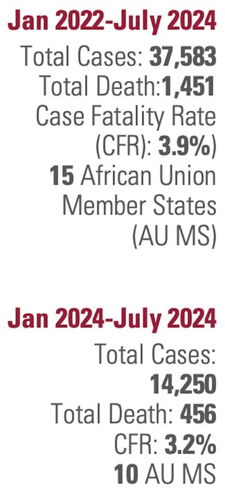 Since the beginning of this year and as of July 28, 2024 a total of 14,250 cases (2,745 confirmed; 11,505 suspected) and 456 deaths (CFR: 3.2%) of mpox have been reported from 10 AU MS: Burundi (8 cases; 0 deaths), Cameroon (35; 2), CAR (213; 0), Congo (146; 1), DRC (13,791; 450), Ghana (4; 0), Liberia (5; 0), Nigeria (24; 0), Rwanda (2; 0) and South Africa (22; 3). This represents a 160% and 19% increase in cases and deaths, respectively, in 2024 compared to the same period in 2023.