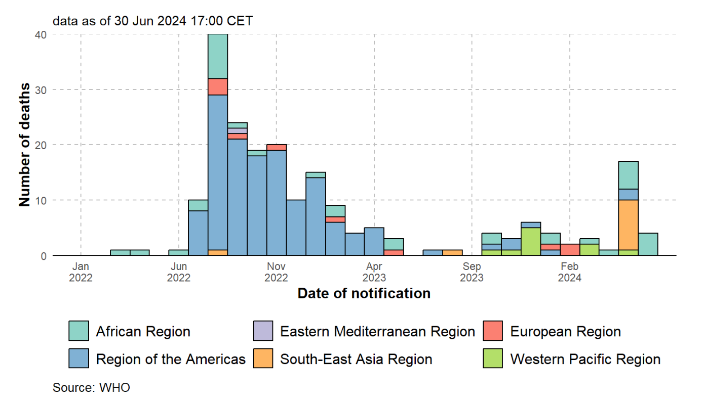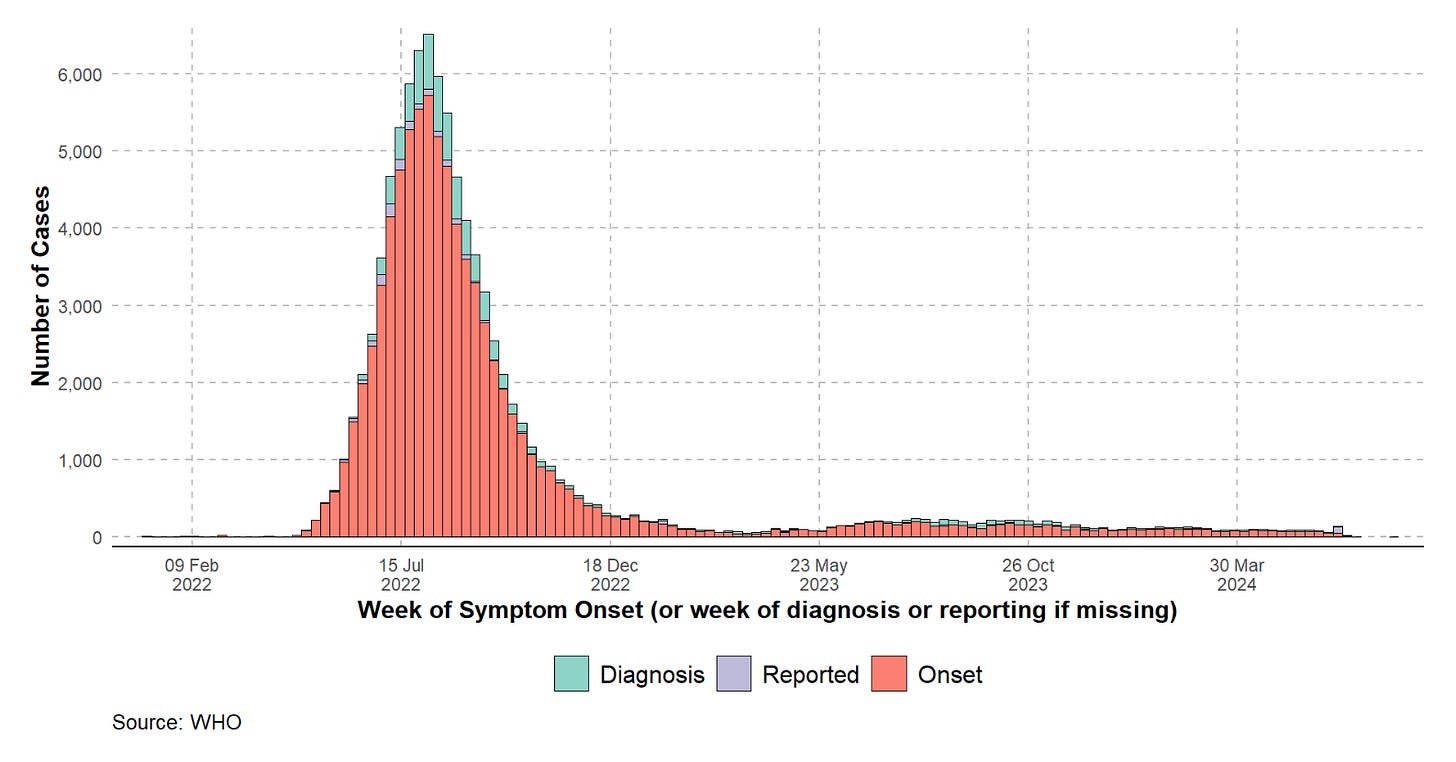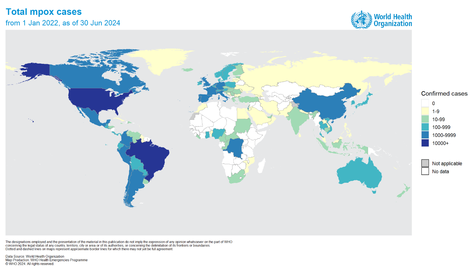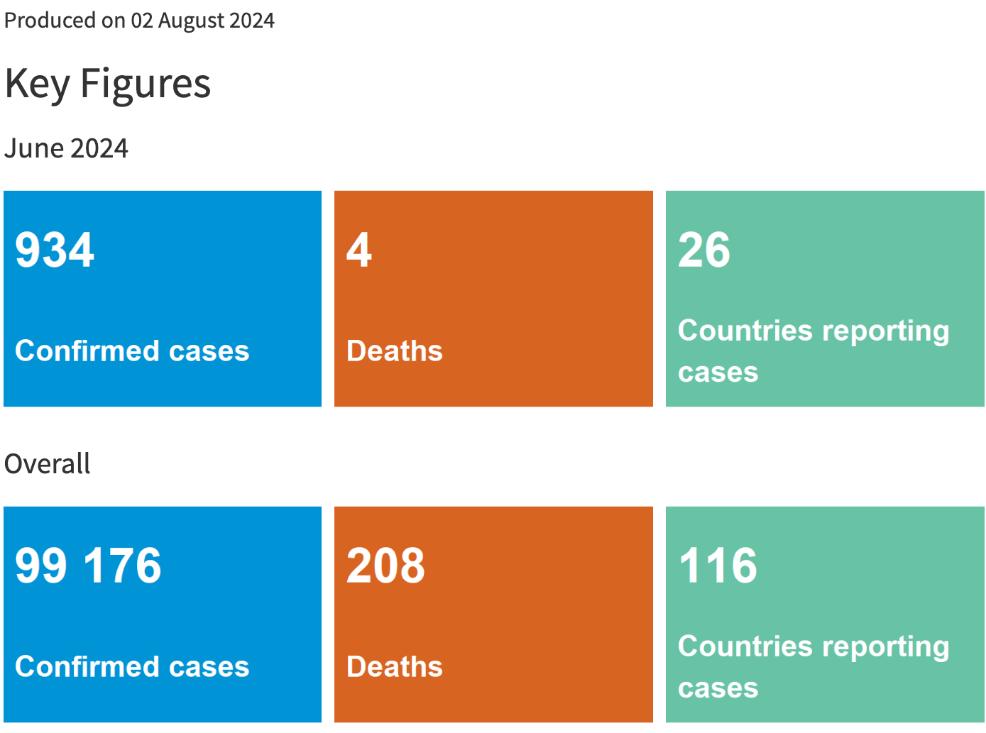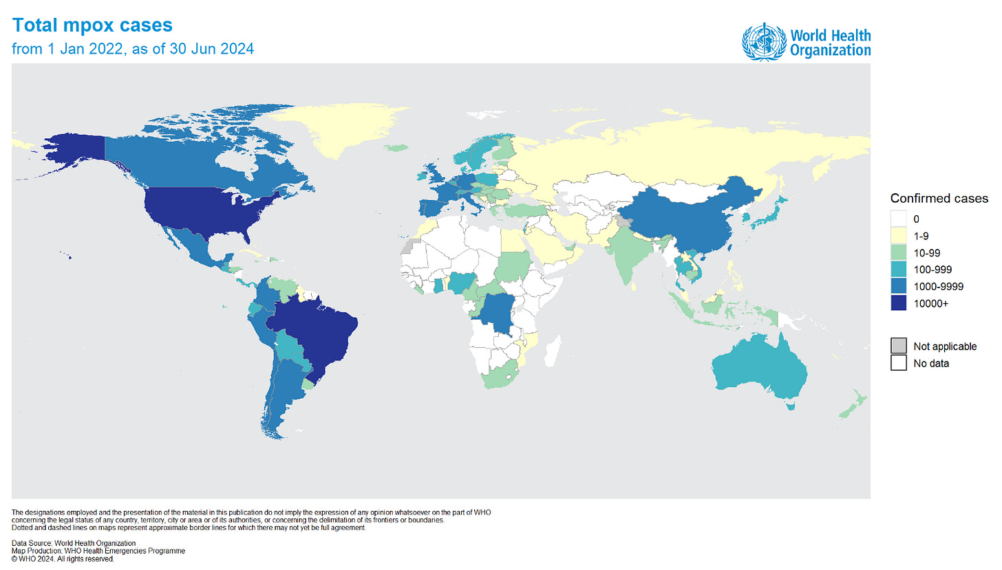 Since the beginning of the global mpox outbreak in 2022 and until the end of July 2024, 99,176 confirmed cases of mpox, including 208 deaths, had been reported by 116 countries.