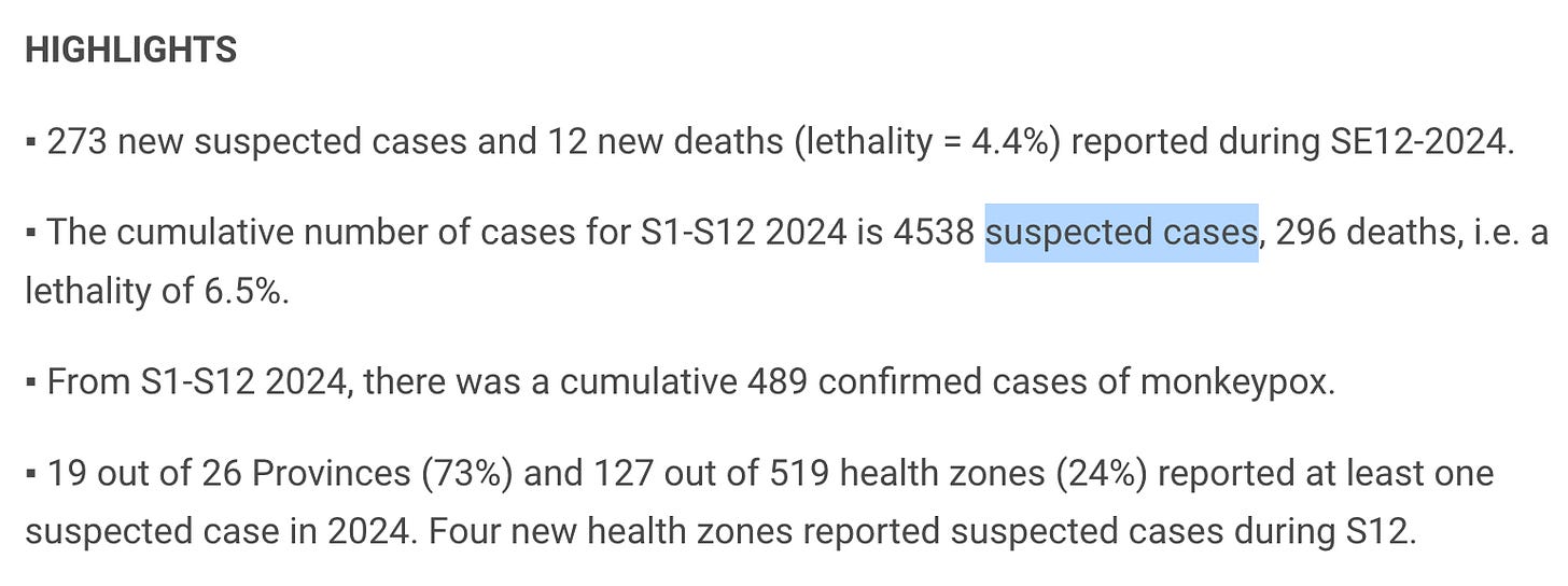 DRC accounts for 96.3% of all cases and 97% of all deaths reported this year. In addition, Chad has reported 24 suspected cases and no confirmed cases this year.