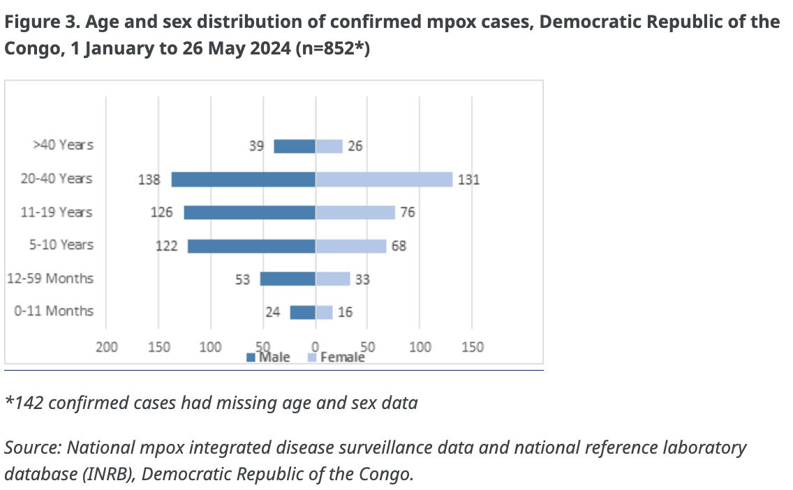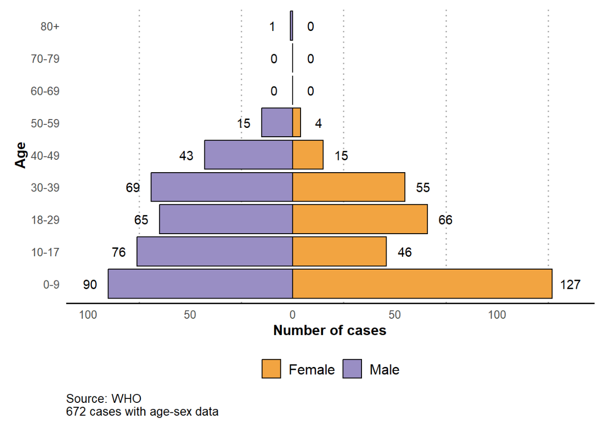 In DRC, most cases and deaths reported are among <15-year-olds, representing 66% of the total cases and 82% of the total deaths. Males account for 73% of the cases in DRC.