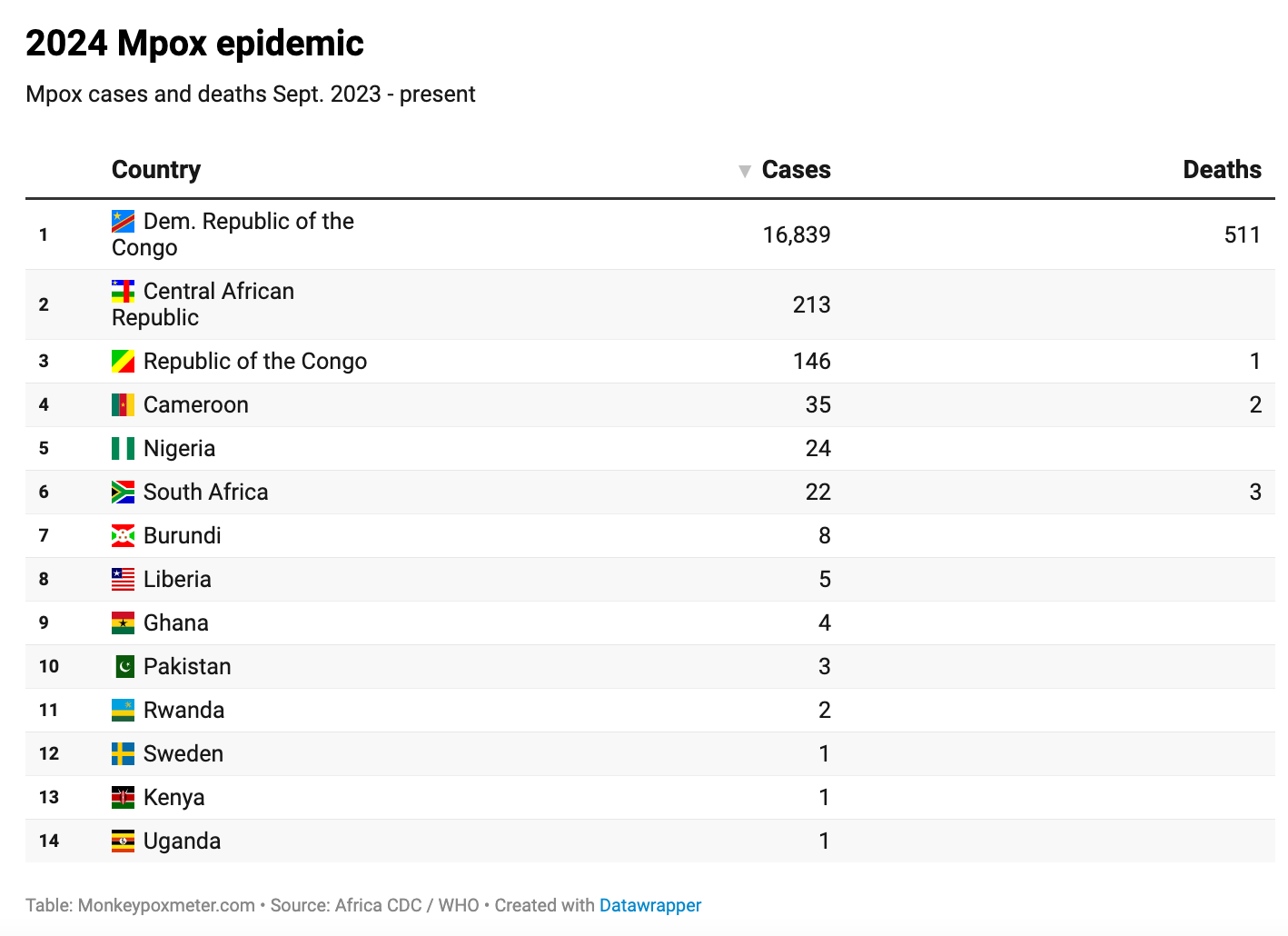 At least 12 African countries, including previously unaffected nations like Burundi, Kenya, Rwanda, and Uganda, have reported Mpox outbreaks. So far in 2024, these countries have confirmed 2,863 cases and 517 deaths, primarily in the Democratic Republic of the Congo (DRC). Suspected cases across the continent have surged past 17,000.