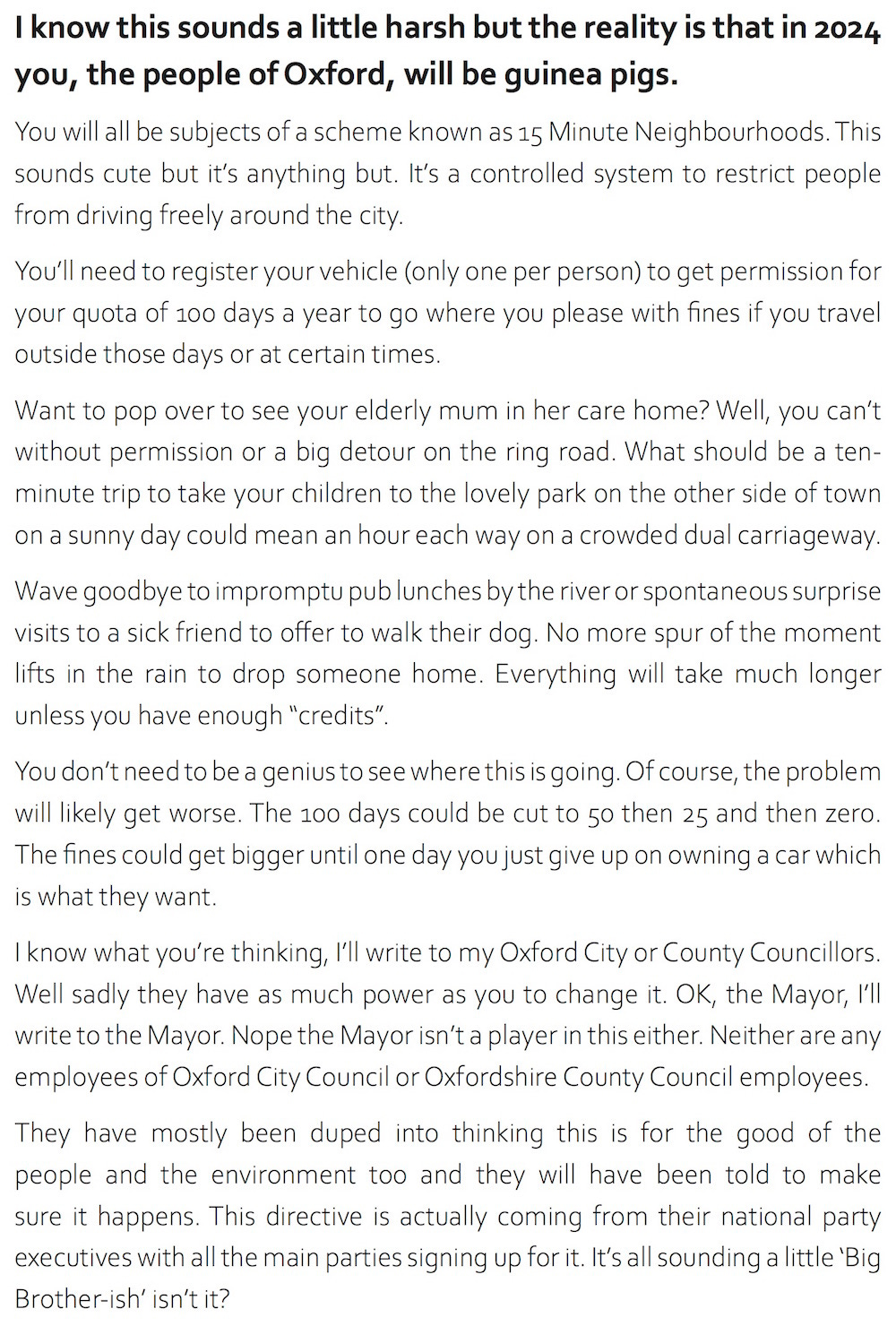 Oxford council would realise within five minutes of analysing their plans that they are utterly idiotic and self-defeating. The fact they seem unprepared to do this at any cost suggests to me they are acting on instructions from higher up.