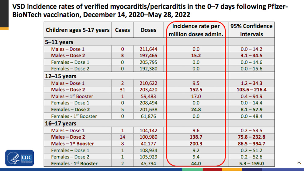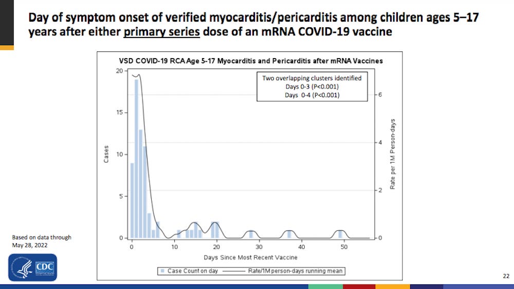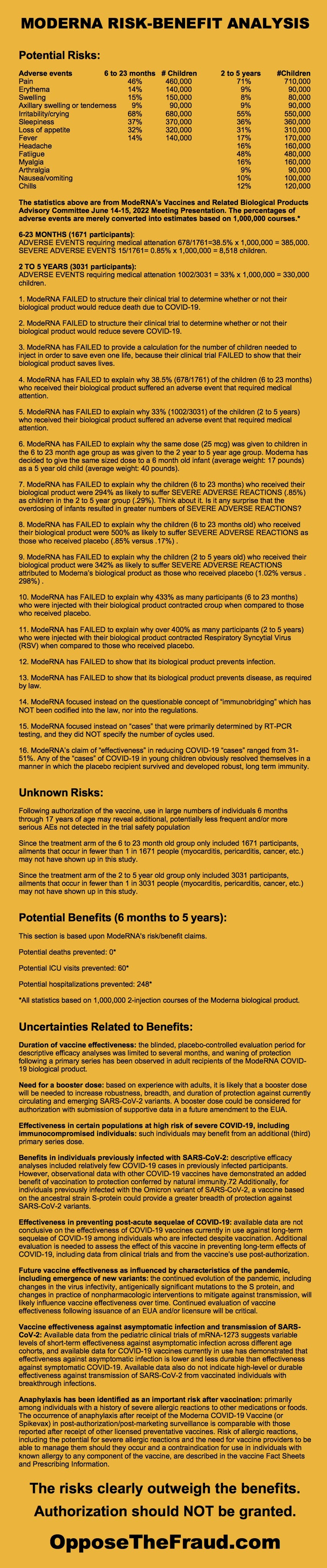 Therefore, the number needed to vaccinate, to prevent a single severe case of Covid-19 in the childhood population is infinity. (Technically it’s undefined because you cannot divide by zero, but you take my point). The FDA and CDC guidance documents for how to write a risk benefit assessment state that one must provide a number needed to treat, the absolute risk reduction, and the relative risk reduction. Moderna just skipped all that because the cartel makes its own rules.