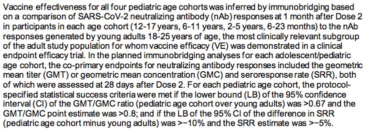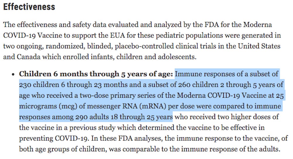 After these sleights of hand, Moderna then compares the antibody levels in the blood of about 10% of the children against the antibody levels in a sample of about 300 adults ages 18 to 25 enrolled in a previous clinical trial. If the antibody levels are similar (which they are), Moderna claims, ‘And therefore it will prevent disease in the future in kids!’