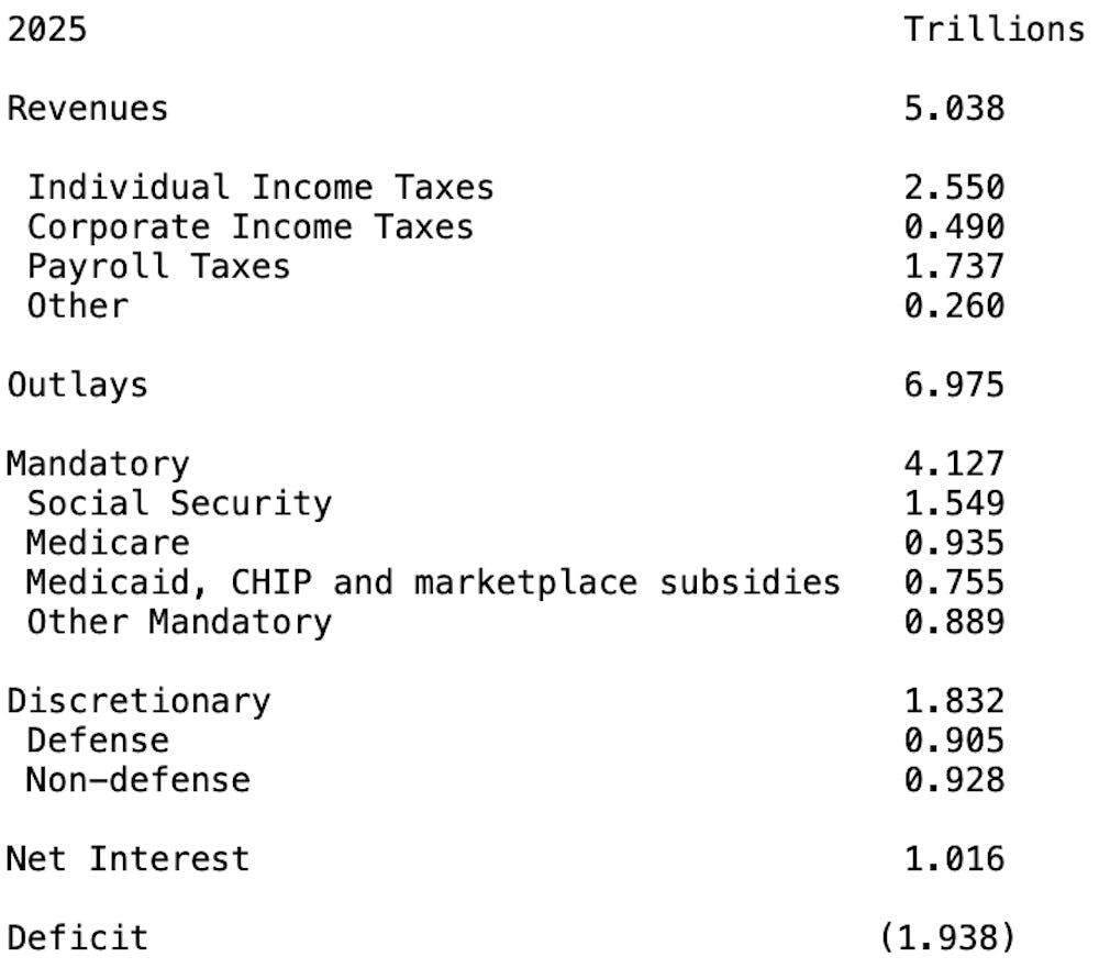 The incoming plutocrats (DOGE) claim that they are going to make the federal government more “efficient.” Well, the vast majority (74%) of the federal government’s projected 2025 “Outlays” are for “untouchable” programs such as Social Security, Medicare, Medicaid and Defense ($5.16 Trillion).
