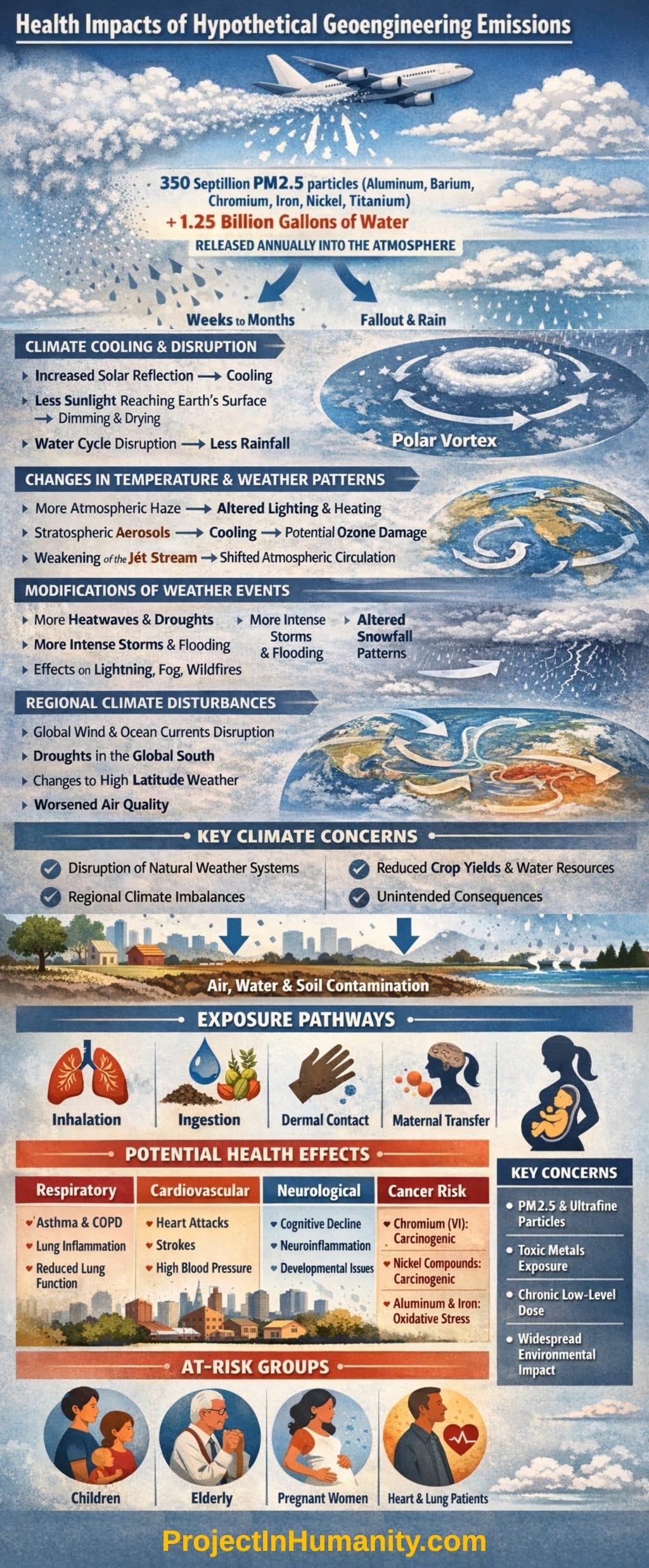 “What would the effect on human health of a geoengineering project be if 350 septillion PM2.5 particles (many of which included Aluminum, Barium, Chromium, Iron, Nickel and Titanium), along with 1.25 billion gallons of water were to be sprayed into the atmosphere at 30,000 to 40,000 feet each and every year?”
