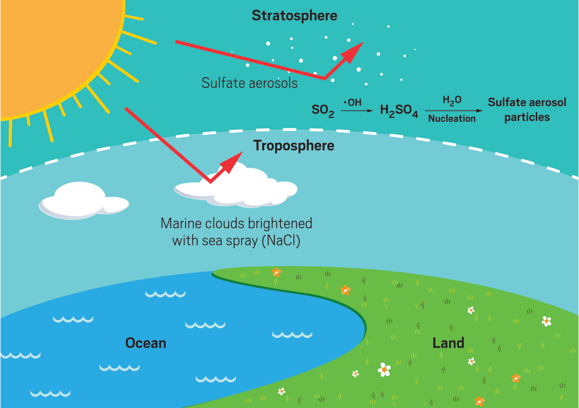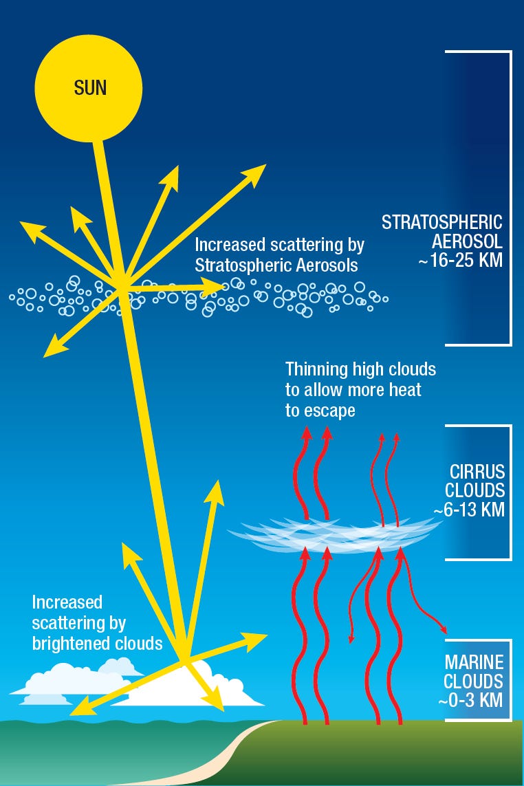 • SO₂ oxidizes to sulfuric acid particles — these scatter sunlight and increase Earth’s albedo, potentially causing temporary cooling (stratospheric aerosols did this after volcanic eruptions).